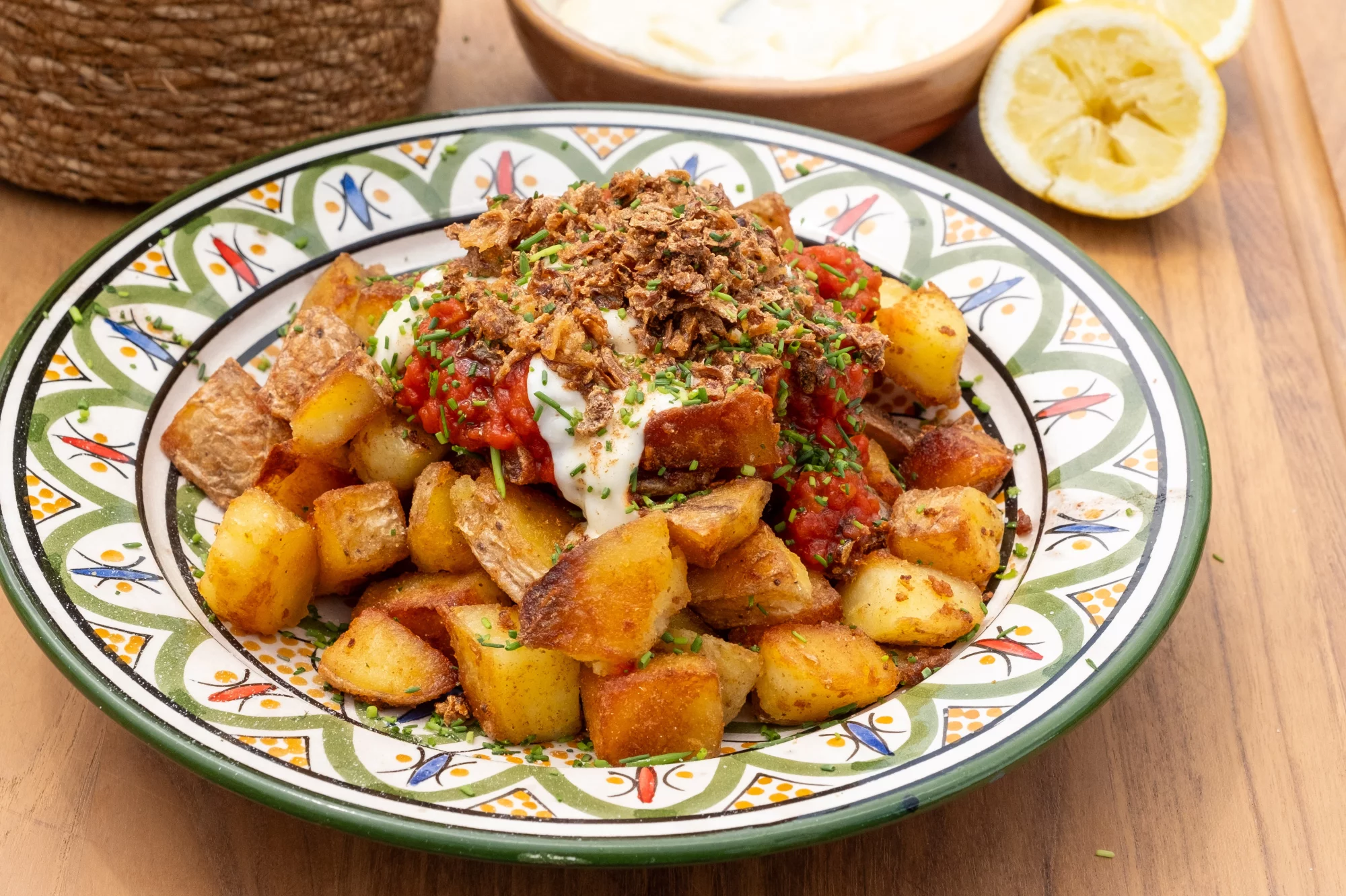 De Spaanse tapasklassieker, maar dan helemaal naar de volgende level getild. Krokant gebakken aardappelstukjes worden overspoeld met een rijke chorizotomatensaus, een frisse looksaus én een nootachtige bruine boter met gefrituurde uitjes. Het is het soort gerecht waarbij iedereen aan tafel onbewust steeds dichter naar de schaal schuift. Perfect als borrelhap, tapasavond of gewoon omdat je de aardappel even in Spaans jasje wil steken.