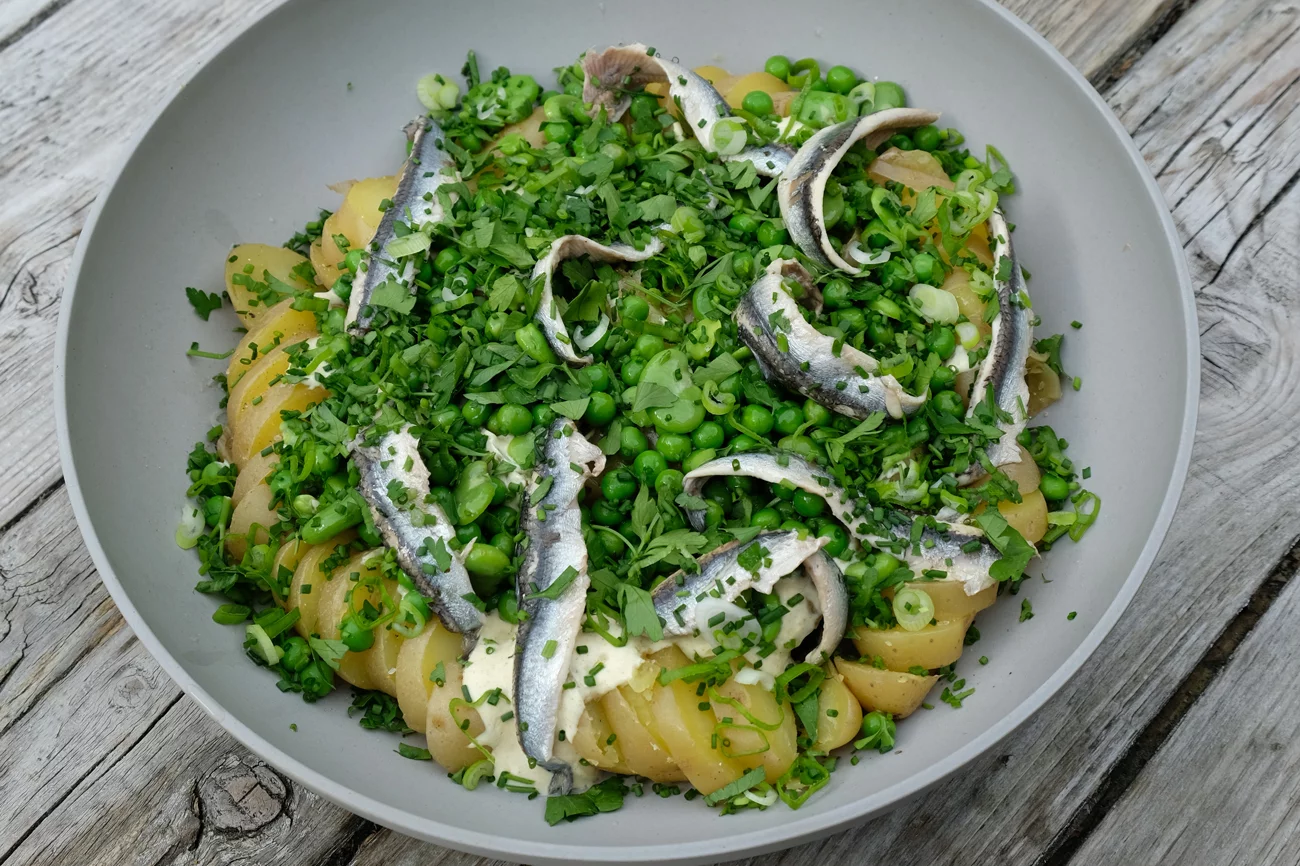 Vergeet de mayonaisezware aardappelsalade van weleer, deze versie is fris, kleurrijk en barst van de smaak. Zachte aardappelplakjes worden gecombineerd met knapperige tuinbonen en erwtjes, een romige currydressing van Griekse yoghurt en limoensap, en een subtiele zilte toets van ansjovisfilets. Ideaal als zomerse BBQ-salade of een vlotte lunchlunch op een warme dag.