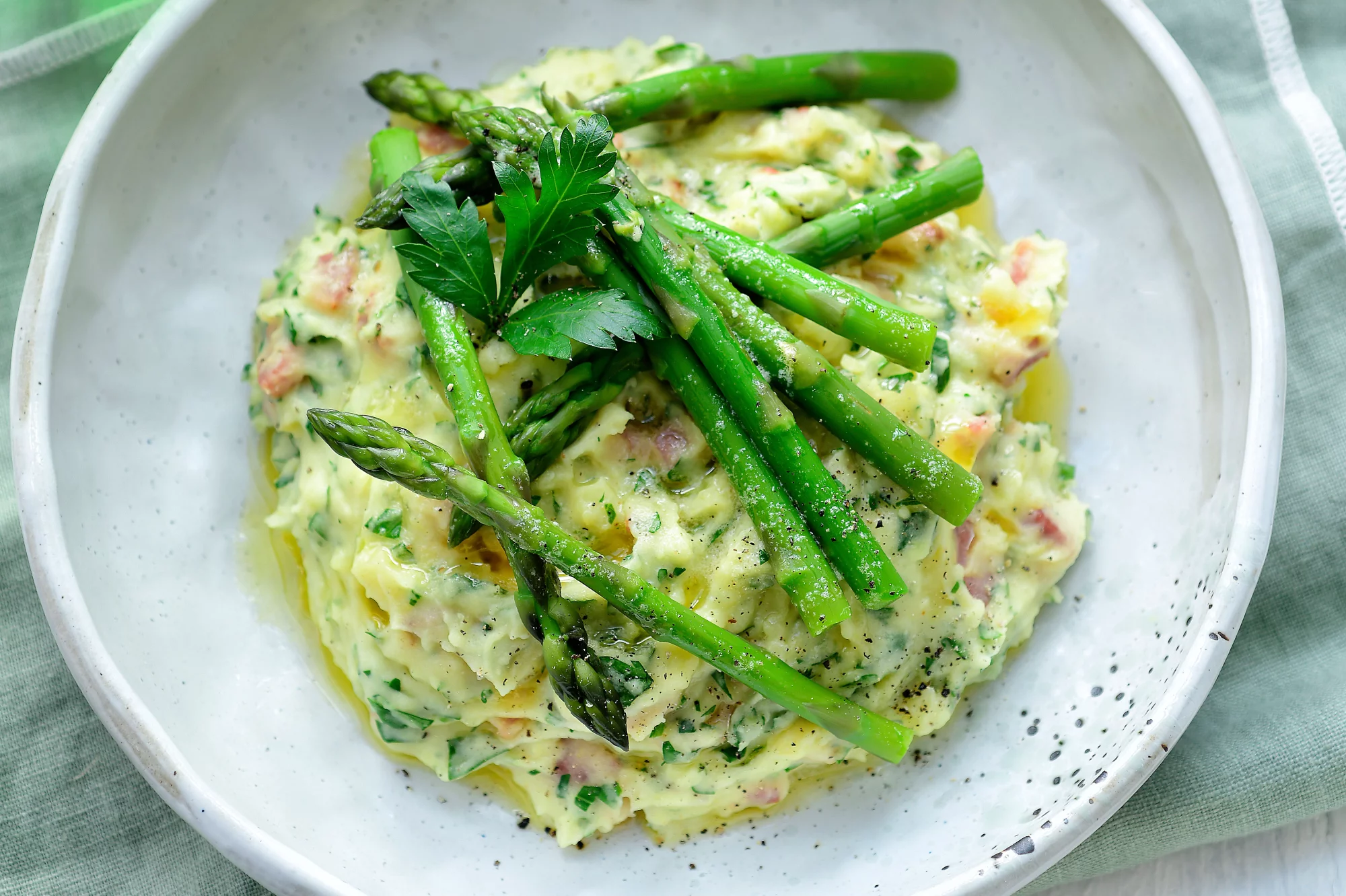 De klassieke puree is goed, maar dít is beter. De zure room maakt hem lekker fris, de uitgebakken spekjes zorgen voor een knapperige bite, en de groene asperges brengen meteen die heerlijke lentesfeer op het bord. Simpel klaar te maken in minder dan 30 minuten, maar het resultaat oogt en smaakt als iets uit een bistro.