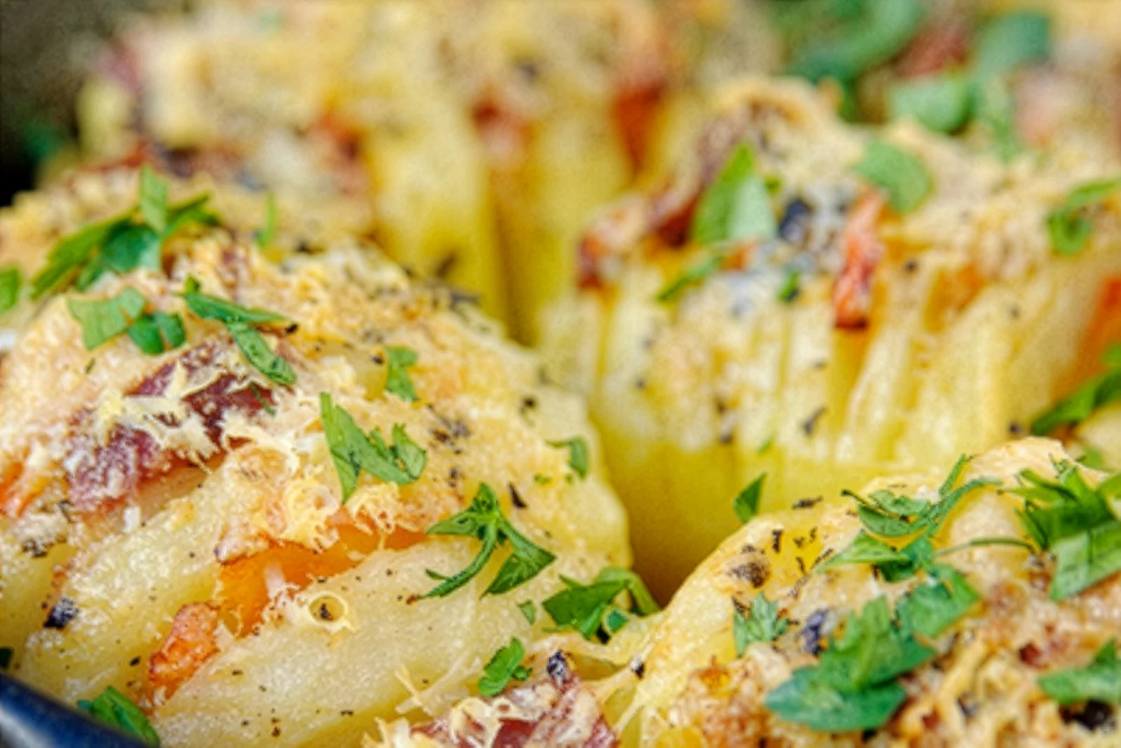 Dit recept bewijst dat je met een beetje creativiteit het meest gewone bijgerecht kan omtoveren tot iets feestelijks. De aardappelen worden ingekerfd en gevuld met bacon en tomaat, zachtjes gegaard in kippenbouillon, en afgewerkt met een knapperige laag Parmezaan uit de oven. Het ziet er spectaculair uit, maar is verrassend eenvoudig te maken. Weekendcomfort op zijn best!