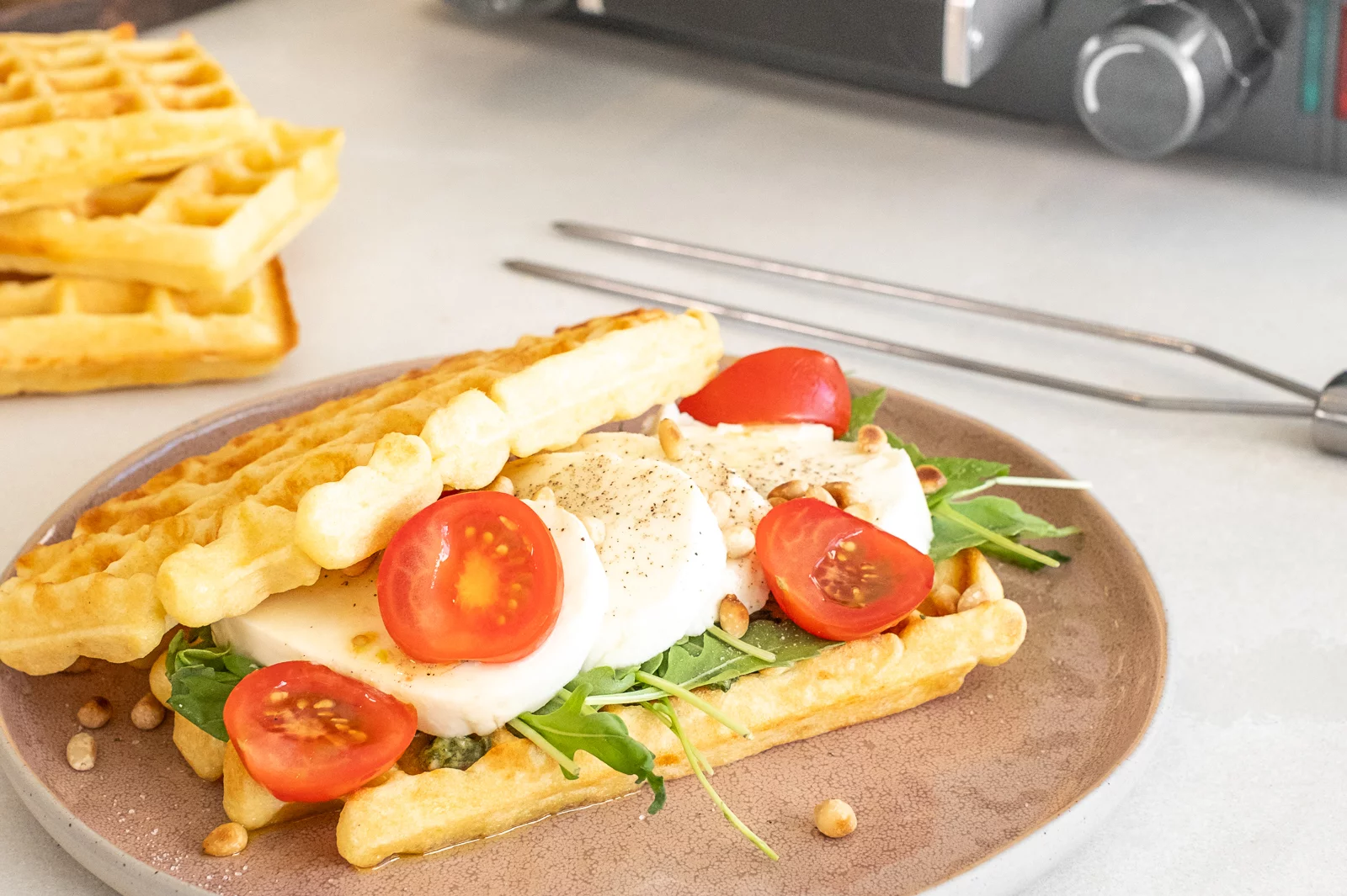 Knapperige wafels van geraspte aardappel en Parmezaan als burgerbroodje? Ja, dat bestaat, en nee, je wil nooit meer iets anders. Bak het beslag goudbruin in het wafelijzer en beleg met rucola, mozzarella, basilicumpesto en kerstomaatjes. Perfect voor een zomerse brunch, een snelle lunch of gewoon omdat je eens iets anders wil. Dit recept is ook viraal gegaan op TikTok — en terecht!