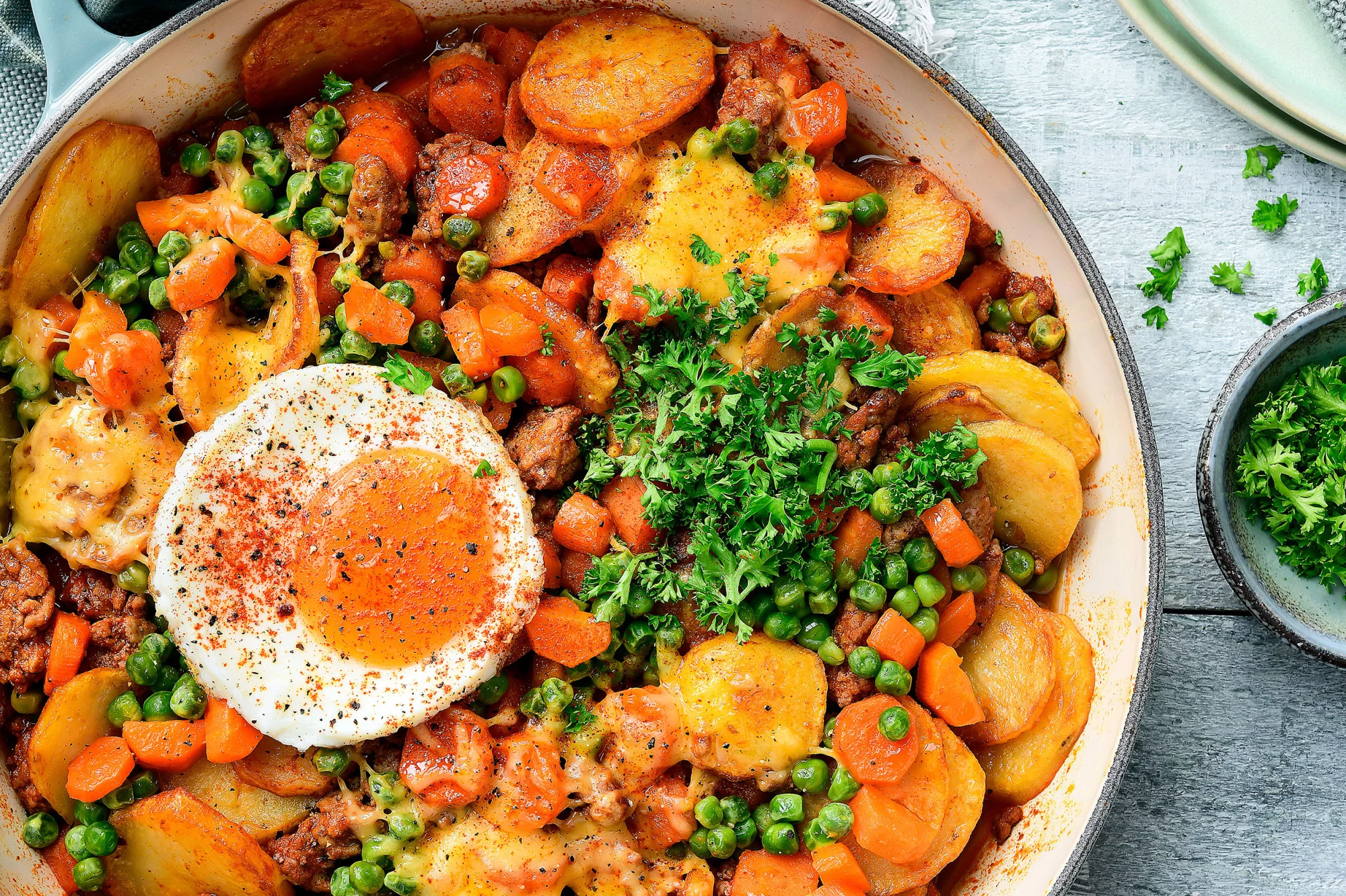 Dit is het recept dat je op tafel zet als de dag lang was en je honger groot is. Dunne aardappelschijfjes, rundergehakt, wortelen, erwtjes en een mooie laag gesmolten oude kaas en dan nog eens een spiegelei bovenop als kers op de taart. Pure troostfood die de hele familie blij maakt, van de eerste tot de laatste hap.