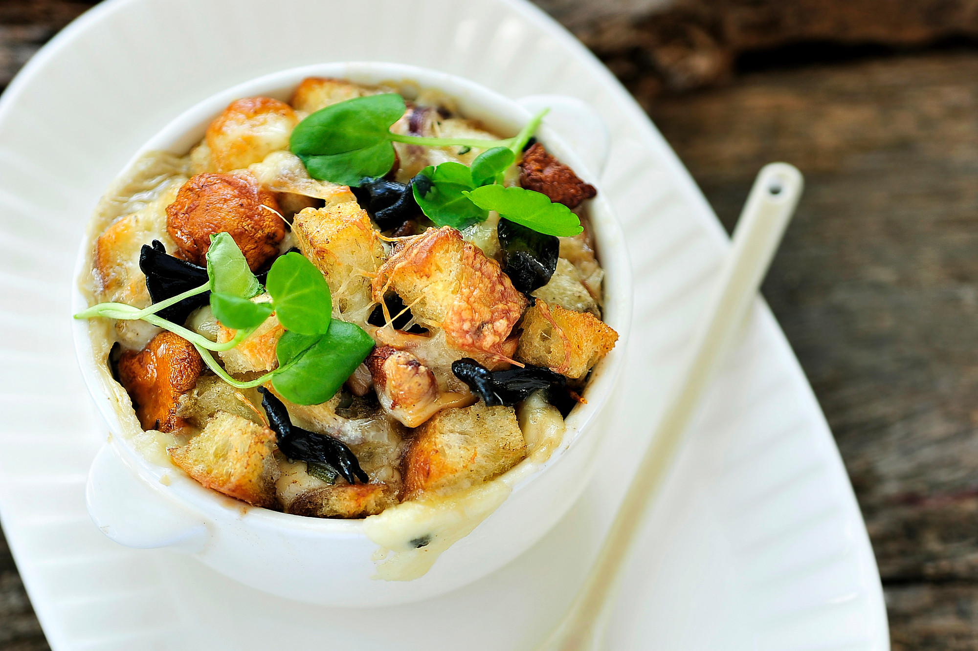 Deze hartige broodpudding met bospaddenstoelen combineert zuurdesembrood met een romig eier- en Comté-mengsel. De paddenstoelen brengen een herfstig accent en worden kort gebakken met sjalot en tijm voor extra kruidigheid. Een romige melk-roomcustard zorgt voor een goudbruine korst. Perfect als lunch op een kille herfstdag.