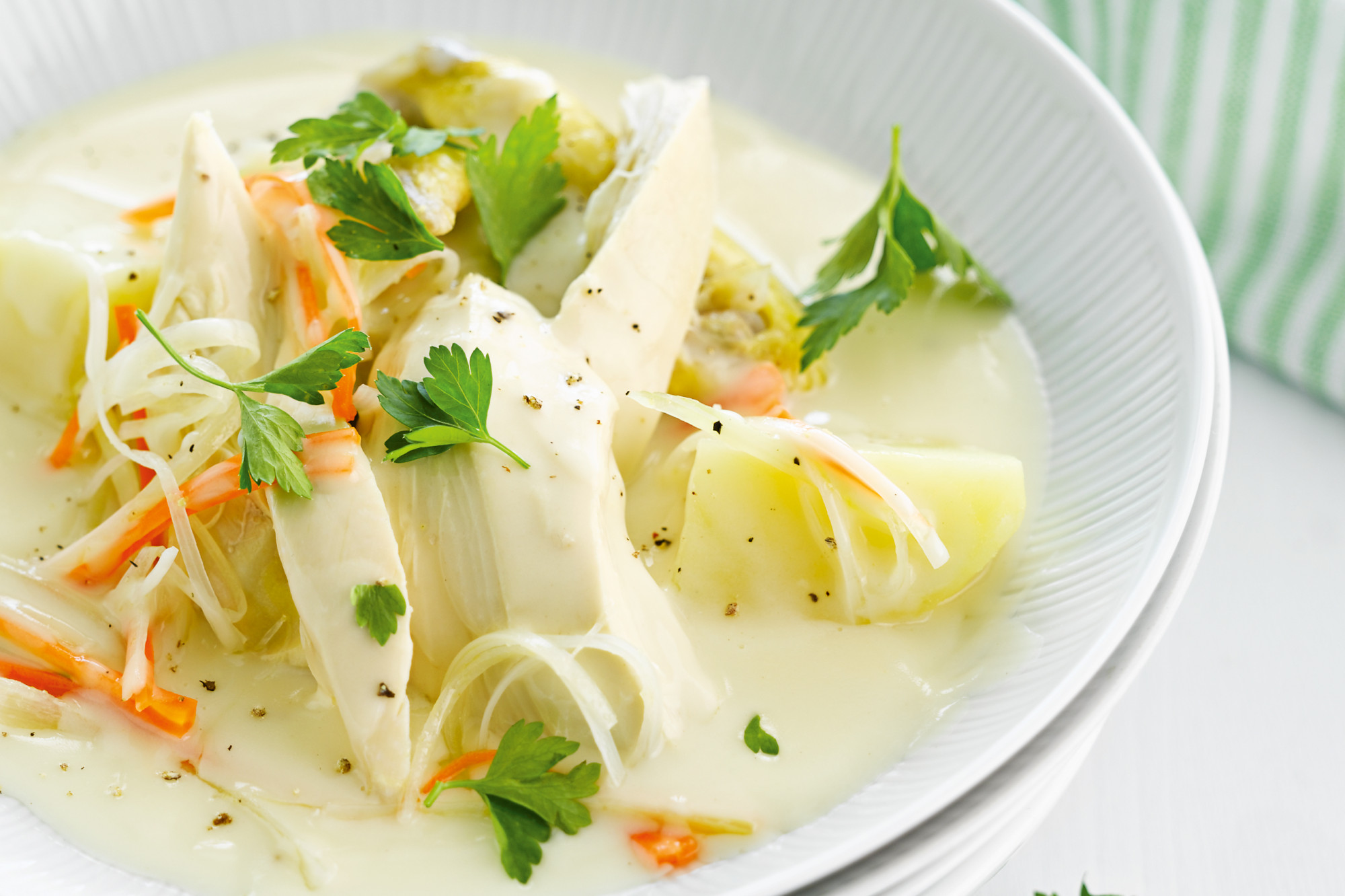 Een verfijnde klassieker uit de Arteveldestad. Deze lichte, romige kippensoep met verse seizoensgroenten en aardappeltjes is het perfecte bewijs dat stoofpotjes ook elegant en subtiel kunnen zijn.