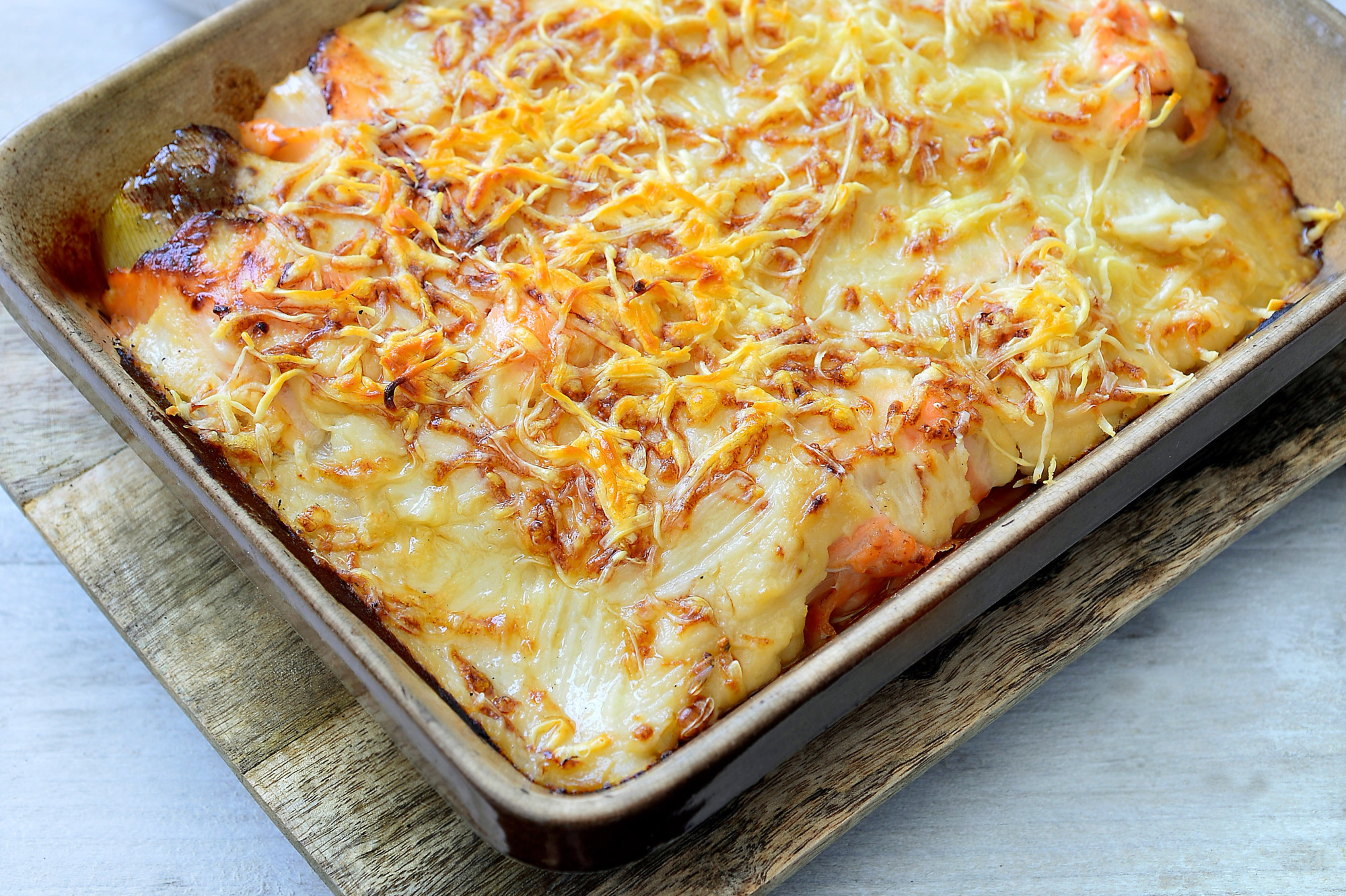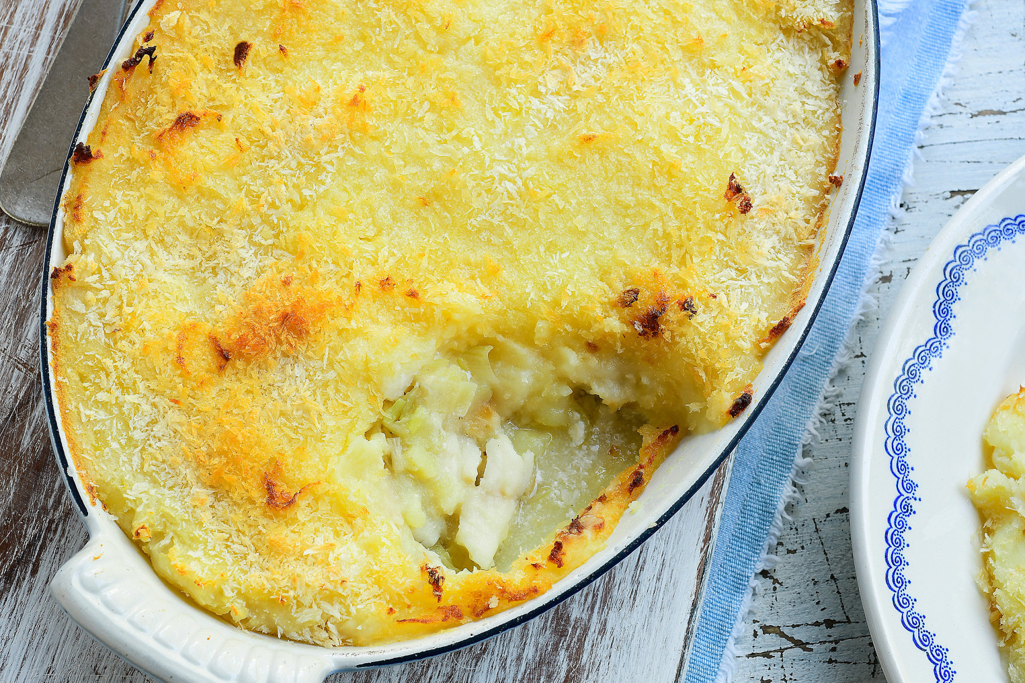 8. Ovenschotel in laagjes met kabeljauw, prei en puree