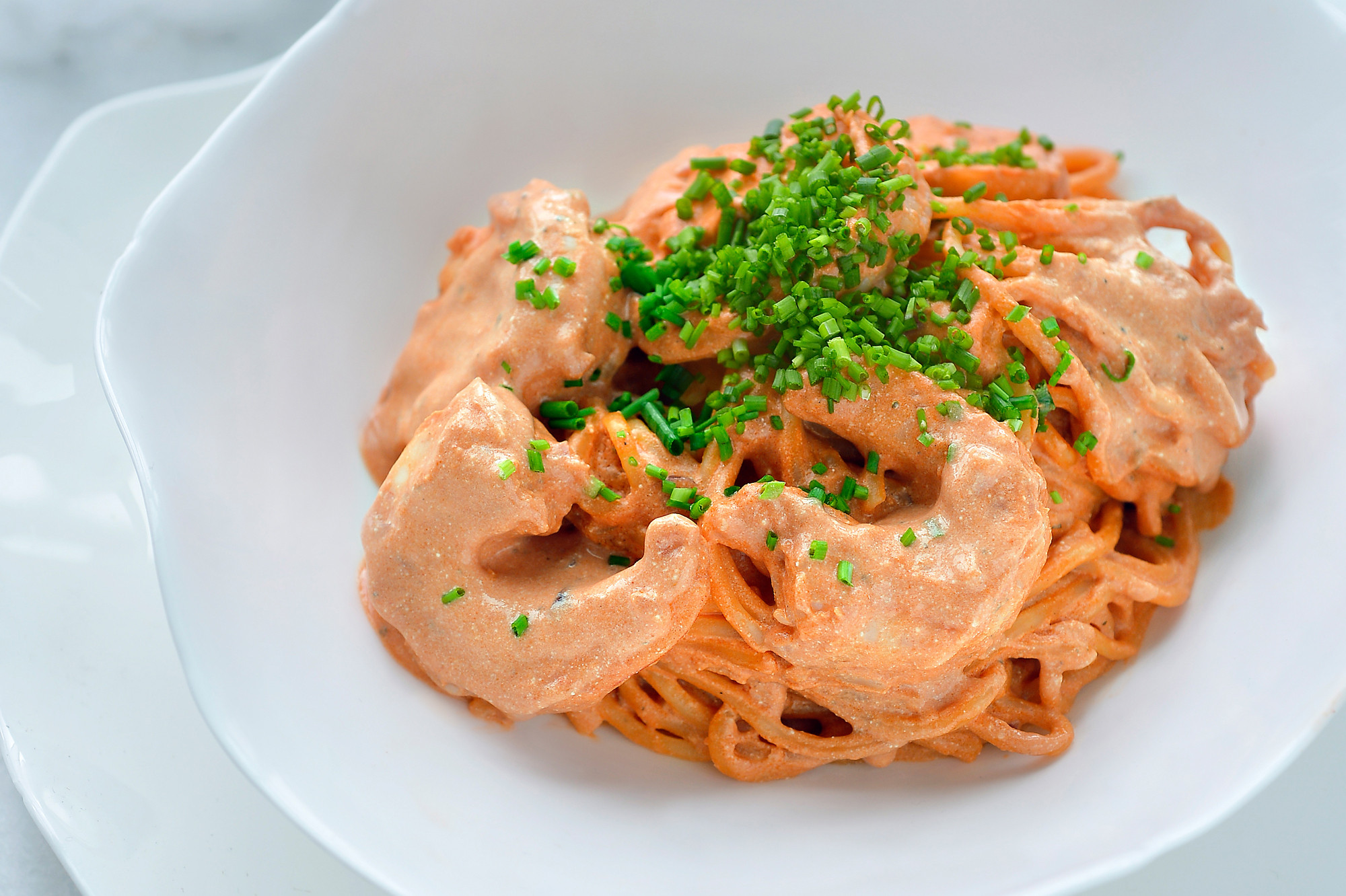 1. Pasta met scampi in tomatenroomsaus