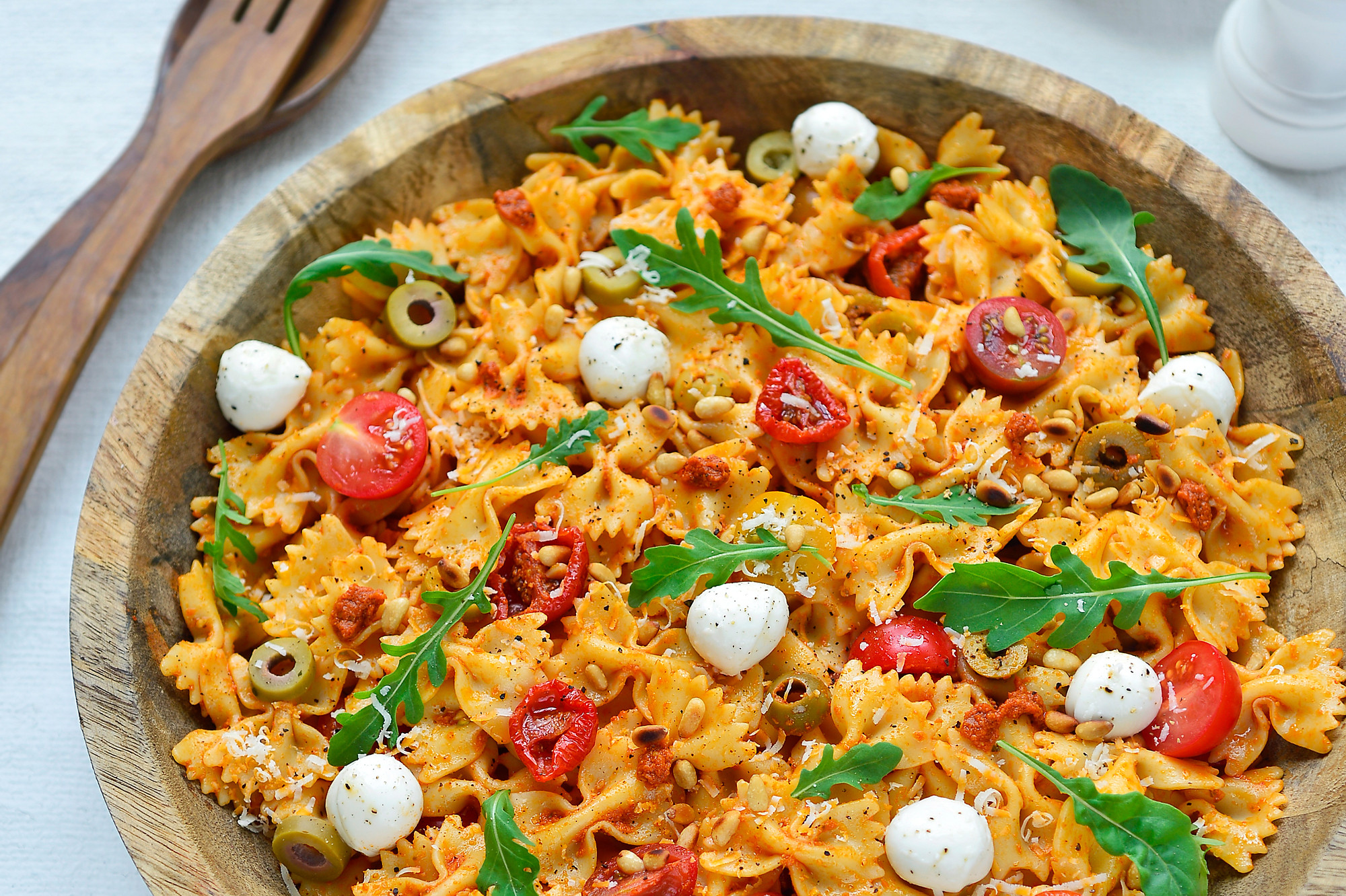 Op warme dagen of als snelle lunch blijft de pastasalade een topper. De rode pesto geeft een zuiderse diepte aan het gerecht, terwijl de bolletjes mozzarella voor een heerlijk frisse toets zorgen.