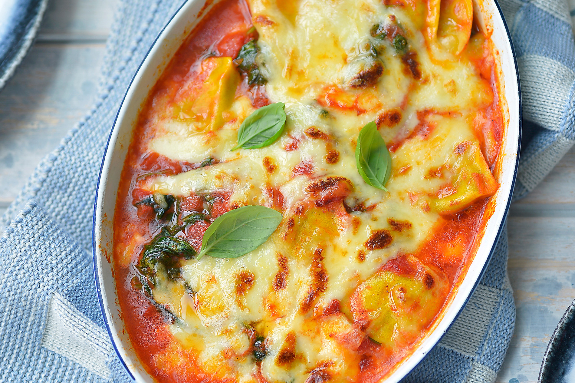 7. Ovenschotel met ravioli, mozzarella en spinazie