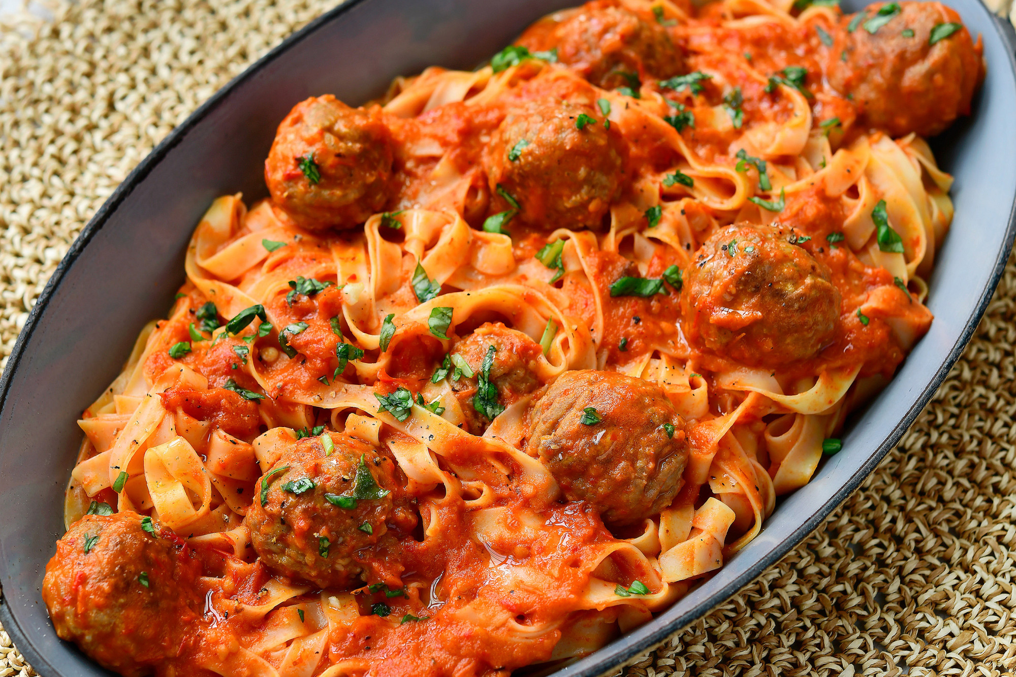 Gehaktballetjes in tomatensaus zijn altijd een voltreffer. Door paprika aan de saus toe te voegen, krijgt het geheel een heerlijke zoete en volle smaak die perfect samengaat met de brede slierten tagliatelle.