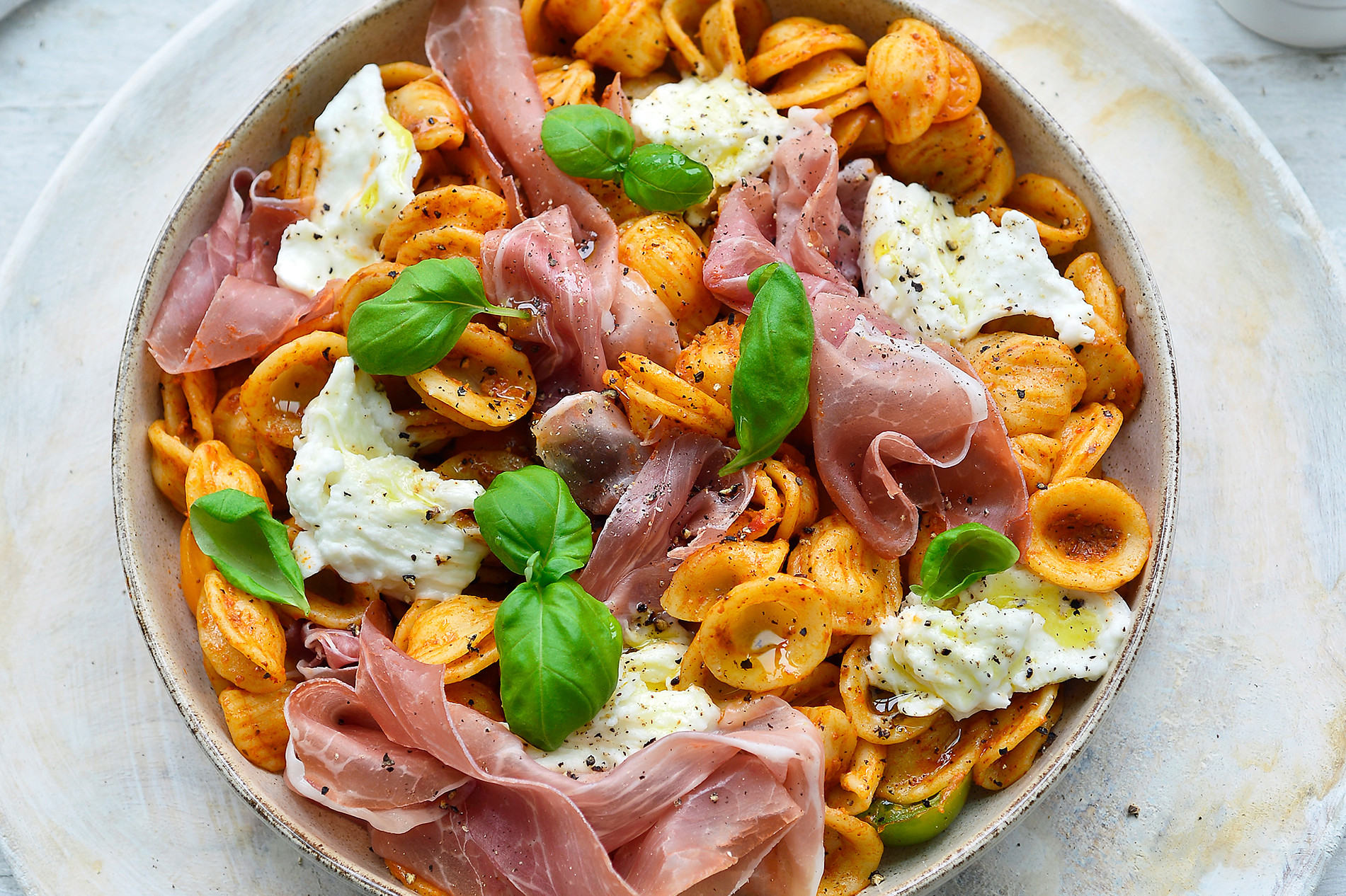 - Orecchiette: Deze oortjespasta is de trots van de Italiaanse streek Apulië. Orecchiette hebben een doorsnede van ongeveer 2 à 3 cm en zijn moeilijk te kneden. Het deukje wordt met de duim in de pasta gedrukt. Recept: Orecchiette met rode pesto, mozzarella en parmaham