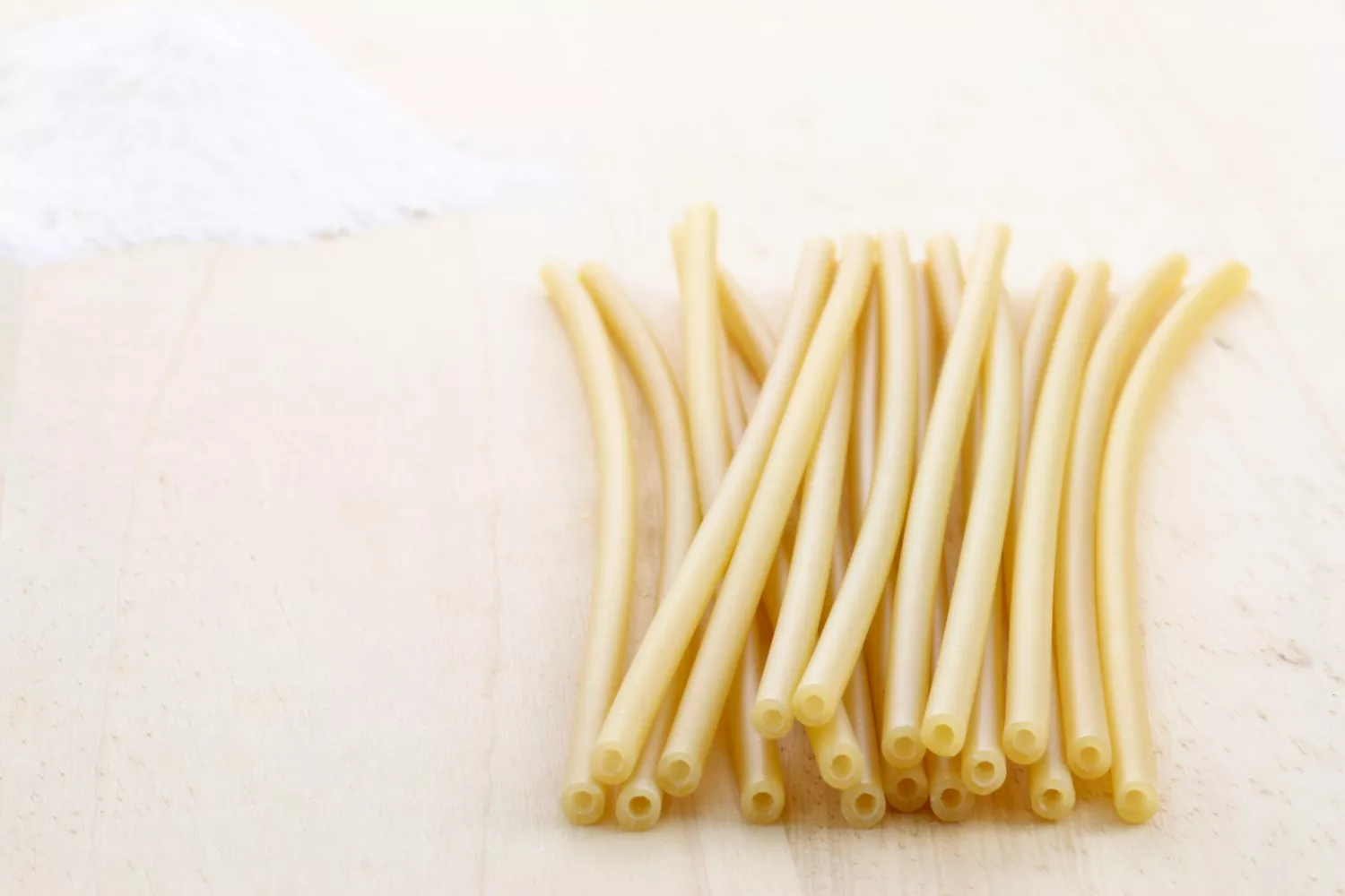 Oftewel lange macaroni ’s. Het zijn lange, holle deegbuizen die zonder de holte te dik zouden zijn om ze beetgaar te kunnen koken. Bucatini zijn een typische Napolitaanse specialiteit.