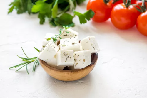Feta is een echte Griekse kaas die wordt gemaakt van schapen- of koemelk. Mag best pittig smaken. De Grieken eten het op elk moment van de dag. Kies een stevige feta om te grillen, dan smelt hij niet volledig. Feta heeft nogal een hoog vetgehalte, dus best niet mee overdrijven.
