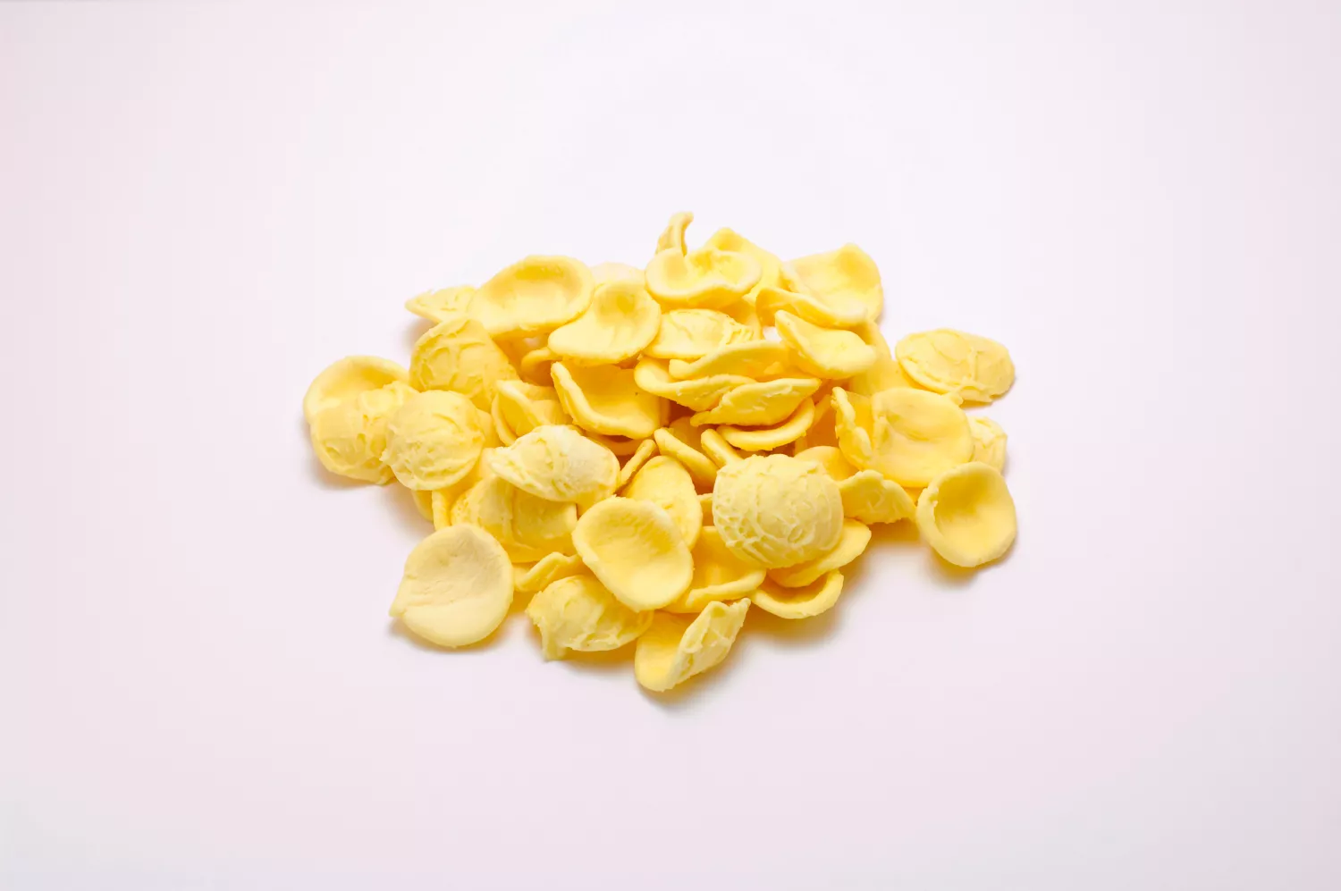 Deze oortjespasta is de trots van de Italiaanse streek Apulië. Orecchiette hebben een doorsnede van ongeveer 2 à 3 cm en zijn moeilijk te kneden. Het deukje wordt met de duim in de pasta gedrukt.