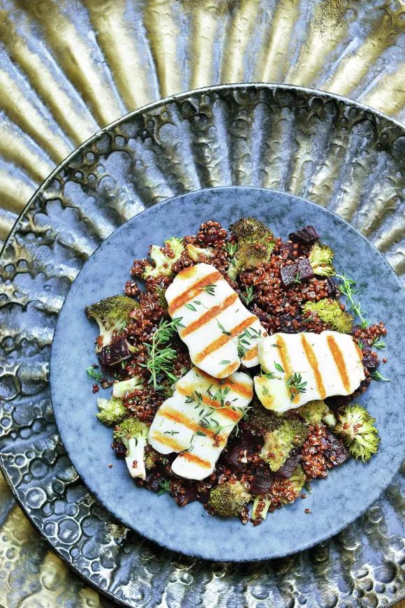 Spoel de quinoa met koud water en kook een deel quinoa in 2 delen water met een deksel op de pan. Laat zachtjes sudderen. Reken ongeveer 75 gram per persoon. De quinoa is gaar als de kleine witte kiempjes van de korreltjes los laten.