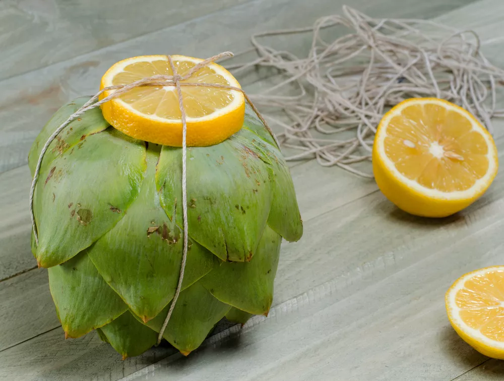 Neem vervolgens twee schijfjes citroen en bind deze met keukentouw vast aan de artisjok.