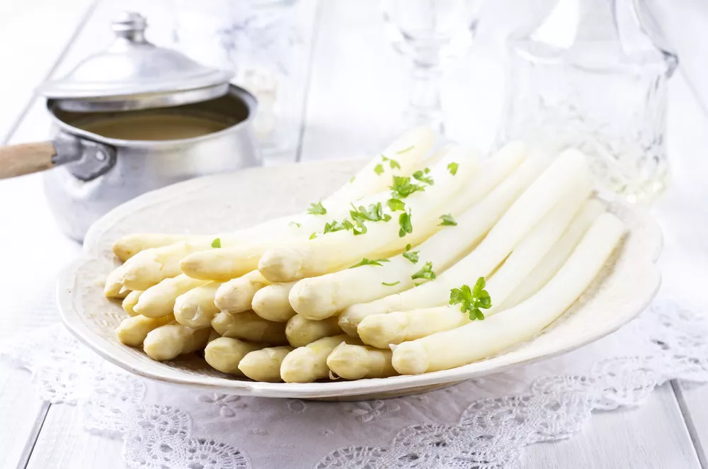 Serveer de asperges bij salade, mousseline, een eitje, …