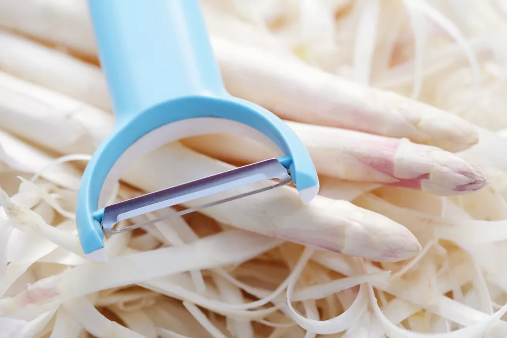 Neem een dunschiller en schil de asperges rondom. Kijk goed na of de asperges voldoende geschild zijn, zo niet zullen ze nogal dradig en taai zijn.