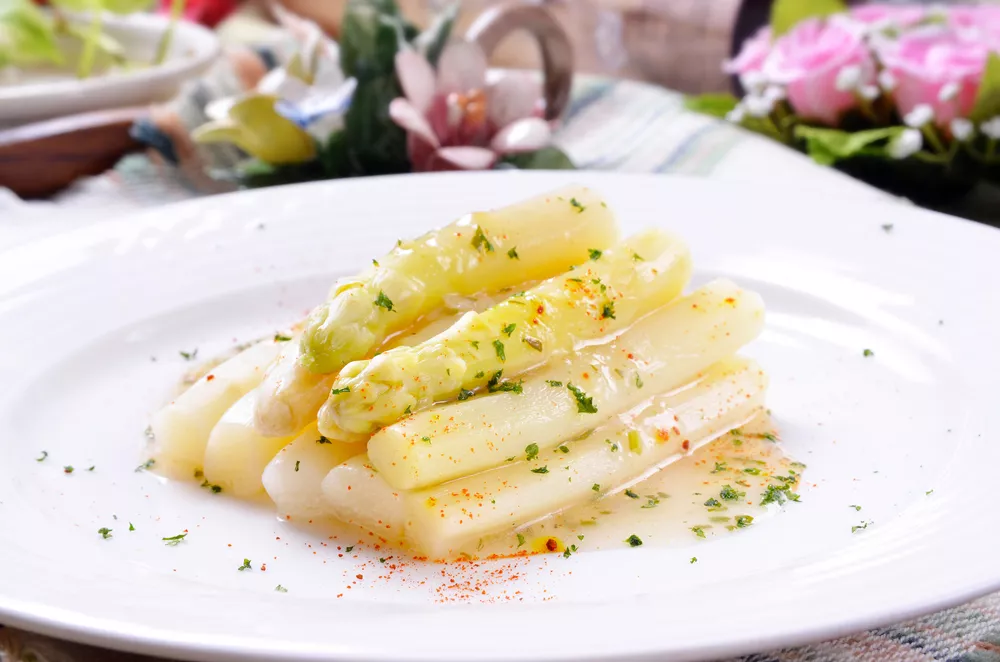 Serveer de gestoofde asperges met een s tukje vis of kip.