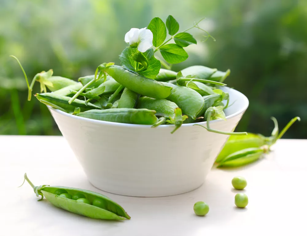 Duw op de erwtenpeulen tot ze lichtjes breken en haal de erwtjes er uit. Vang ze op in een glazen kom.