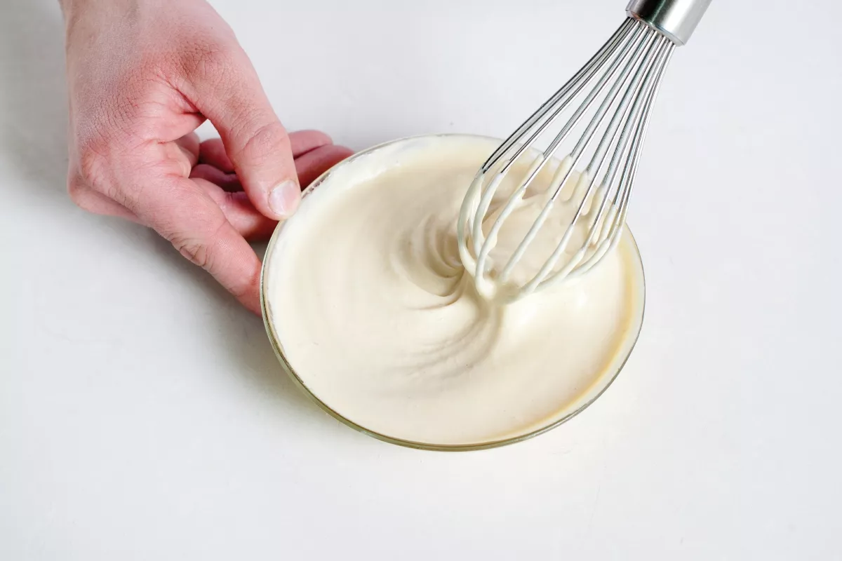 Voeg al kloppend 500 ml maïsolie toe en blijf kloppen tot je een mooie, dikke mayonaise verkrijgt.