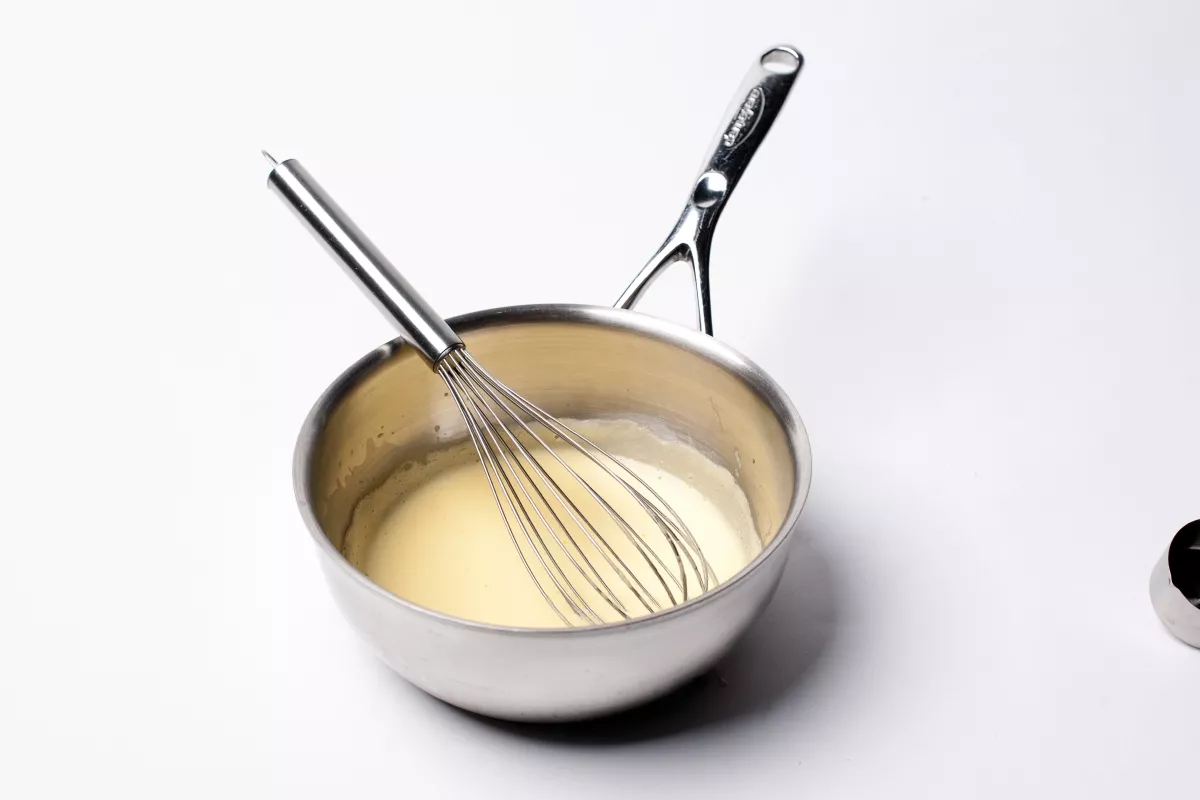 Haal de pan van het vuur en voeg voorzichtig al roerend 500 ml gesmolten boter toe (zorg dat de wei van de boter onderaan in de pot blijft en dus niet mee onder de saus gemengd wordt).