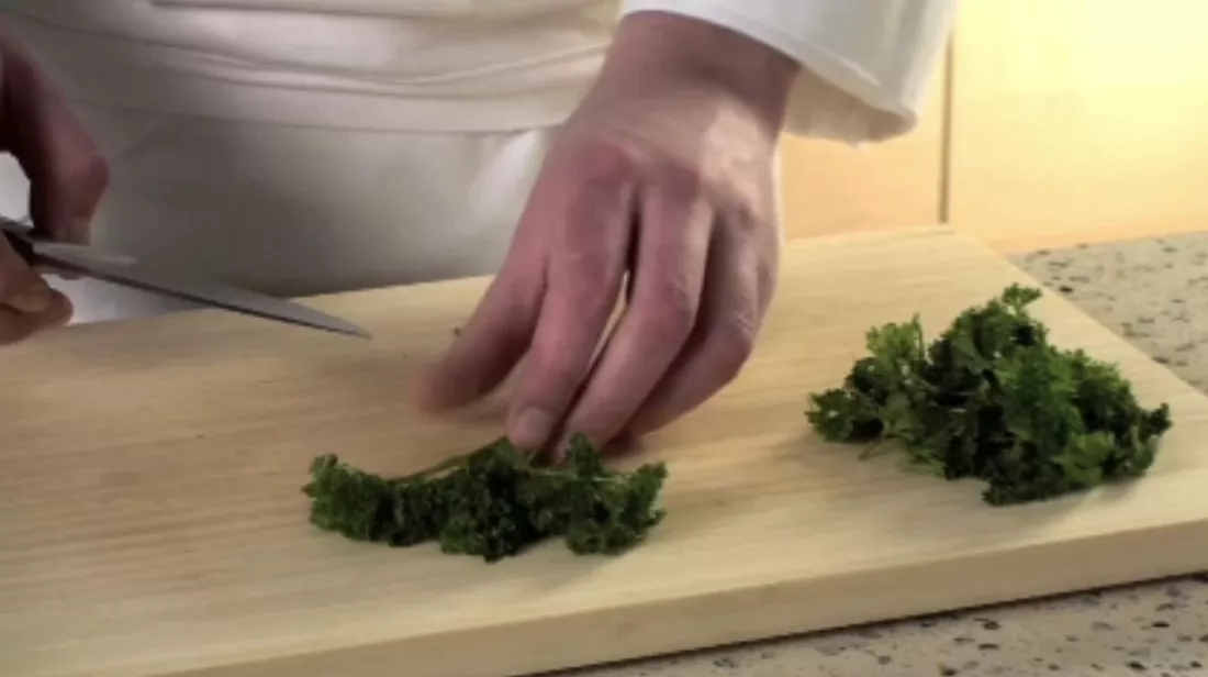 2. Hak met het koksmes in een wiegende beweging de peterselie zo fijn mogelijk. Dit doe je door regelmatig van richting te veranderen en de peterselie op een hoopje te schuiven.