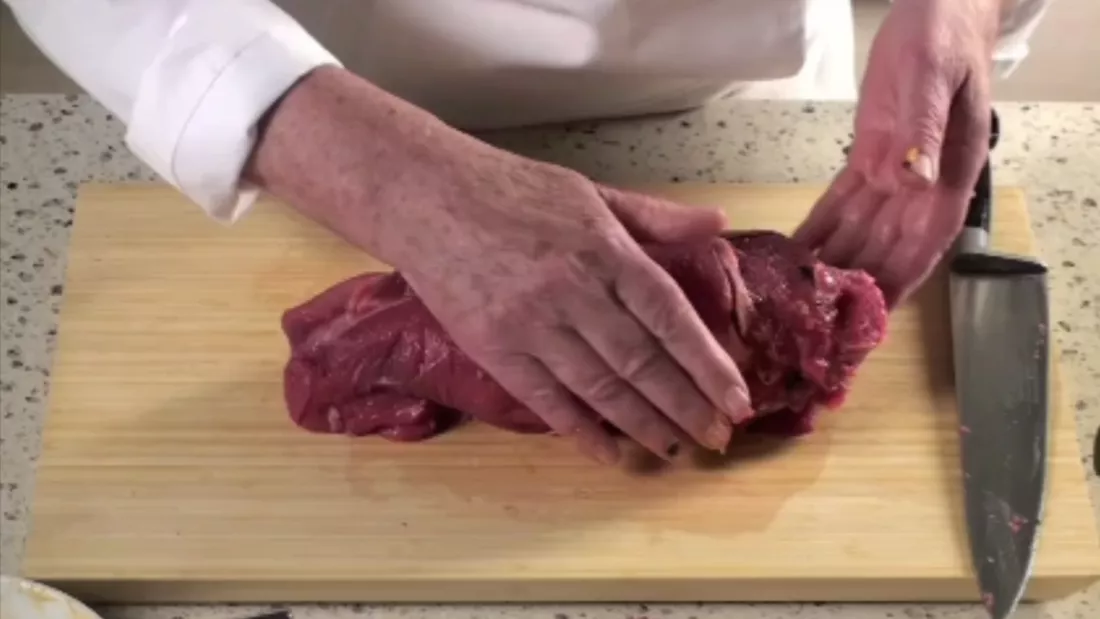 5. Draai het vlees om en breng het keukentouw onderlangs weer terug naar het begin. Knoop het stevig vast.