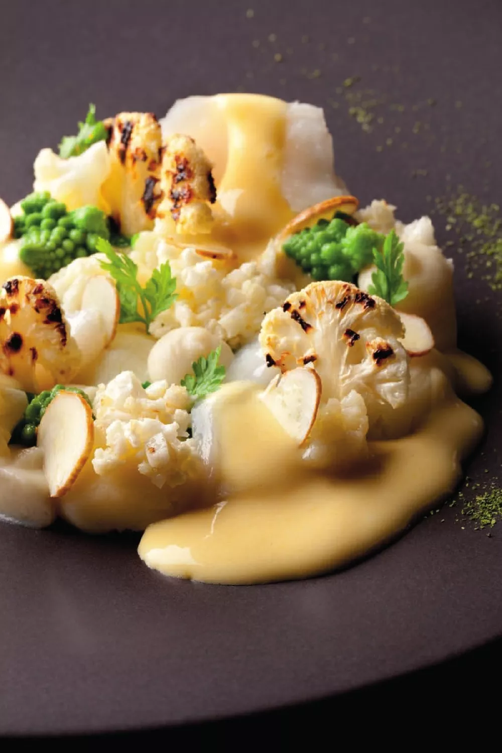 Een hartige en verfijnde combinatie van kabeljauw en bloemkool in drie bereidingswijzen, van romige brandade tot gegrilde roosjes en een fluweelachtige bloemkoolcrème. De vis wordt zachtjes gepocheerd in melk en verwerkt tot smeuïge brandade met aardappelpuree en gerookte paling, terwijl bloemkool geroosterd, gebakken en gepureerd wordt voor textuur en diepte. Afgewerkt met een rijke garnalenemulsie, hazelnoten en kervel is dit feestelijk visgerecht ideaal voor herfst- en winterdiners of als elegant voorgerecht.