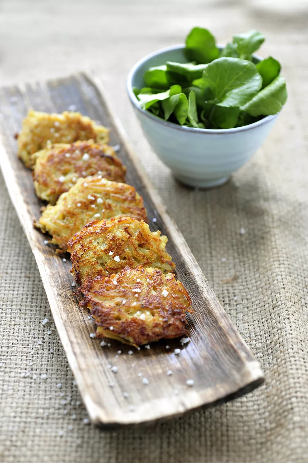 Vorm het mengsel tot kleine, platte schijfjes (gebruik eventueel een ringetje) en bak ze meteen – in enkele beurten – goudbruin in bruisende boter.