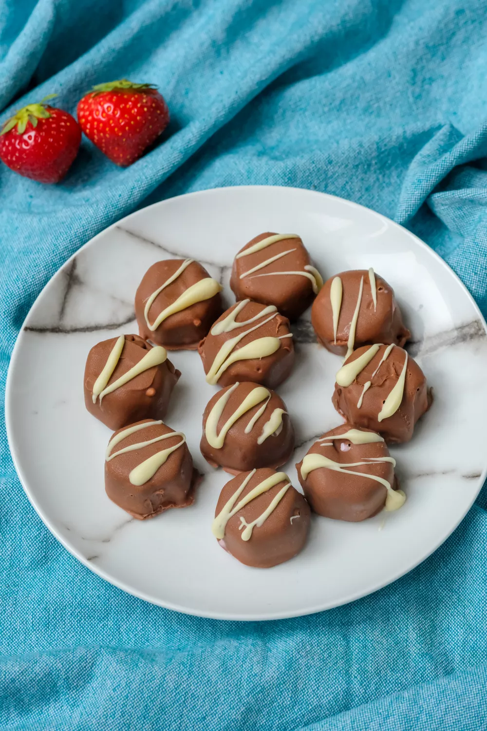 Zomerse aardbeien ijspralines combineren frisse roomkaas met romige melkchocolade en een vleugje witte chocolade tot een feestelijke, hapklare traktatie. Met eenvoudige ingrediënten zoals aardbeien, roomkaas en poedersuiker maak je in de blender een glad mengsel dat je invriest in ijsvormpjes en daarna in chocolade doopt. Ideaal als verfrissend dessert op warme dagen, voor borrels of als handgemaakt snoepje om cadeau te geven.