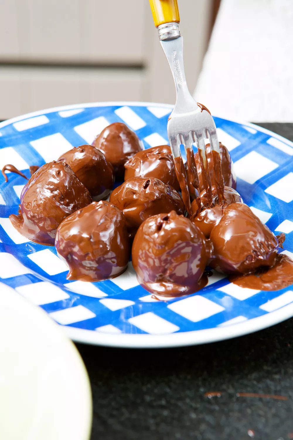 Snijd de chocolade in kleine stukjes en doe ze in een pot. Zet de pot au bain-marie en smelt de chocolade. Regelmatig roeren zodat de chocolade gelijkmatig op een laag vuurtje smelt.