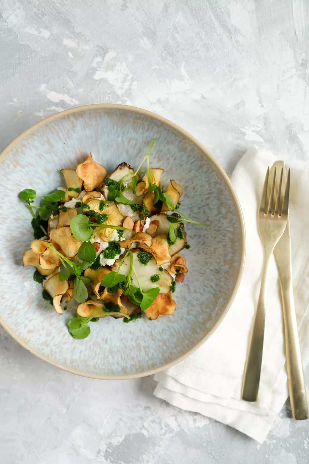 Dit frisse, vegetarische voorgerecht combineert zoete geroosterde aardperen met romige ricotta en pittige waterkers voor een elegante smaaksensatie. Knapperige aardpeerchips uit de friteuse en een groene kruidenolie van peterselie, bieslook en dragon brengen textuur en frisheid, terwijl gerookte amandelen een nootachtige diepte geven. Perfect voor een feestelijk diner of een herfstige lunch en eenvoudig te maken met roosteren, blancheren en frituren.