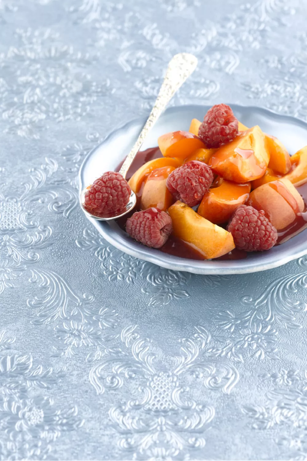 Zomerse abrikozen worden hier overgoten met een fluweelzachte frambozensaus van verse frambozen en rode bessensiroop, gebonden met maïzena voor een lichte, glanzende afwerking. De saus wordt gepureerd, door een zeef gewreven en warm over partjes abrikoos geserveerd. Heerlijk als licht nagerecht of geserveerd met een bolletje vanille ijs.