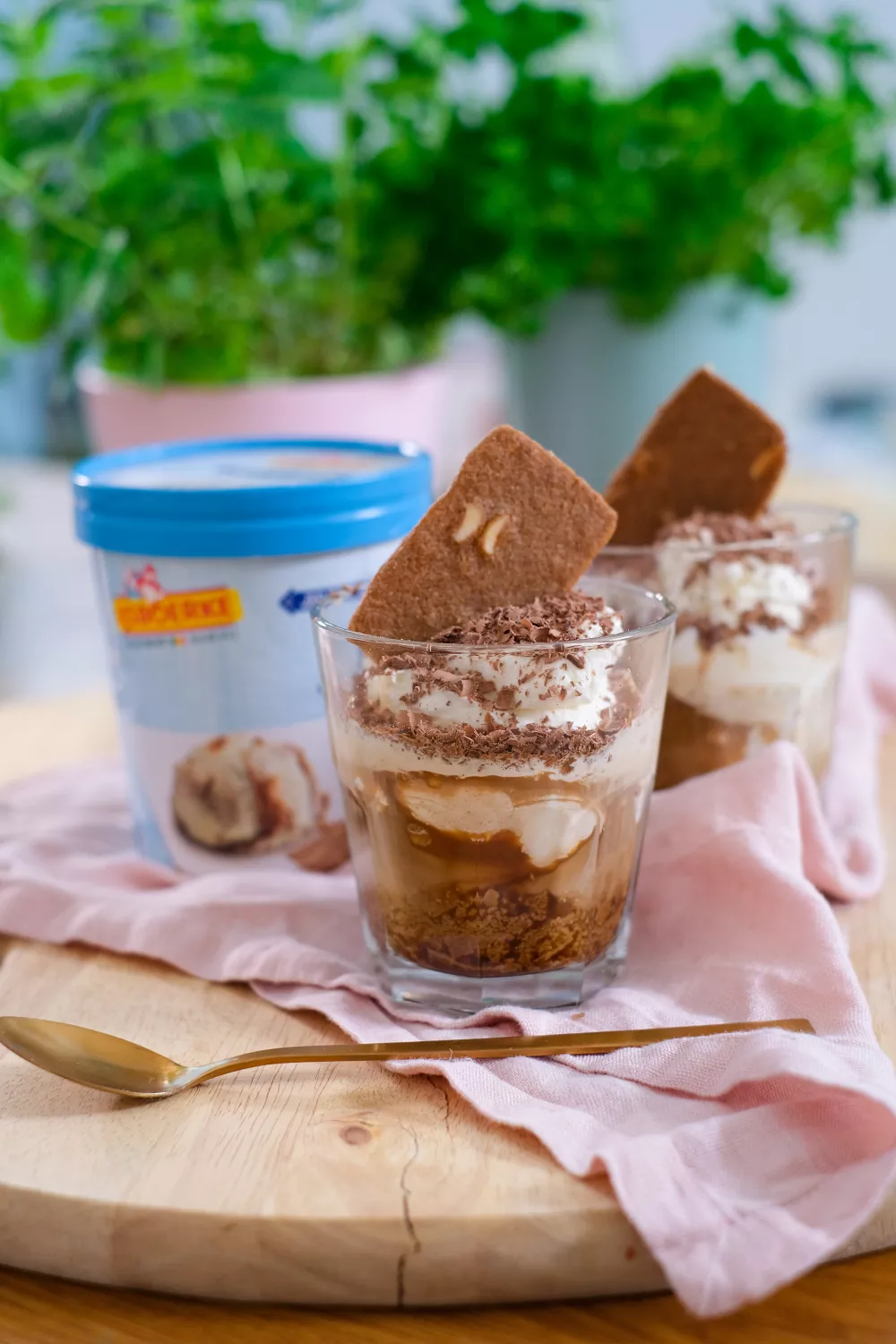 Werk af met een toefje slagroom, chocoladeschilfers en een amandelbroodkoekje.