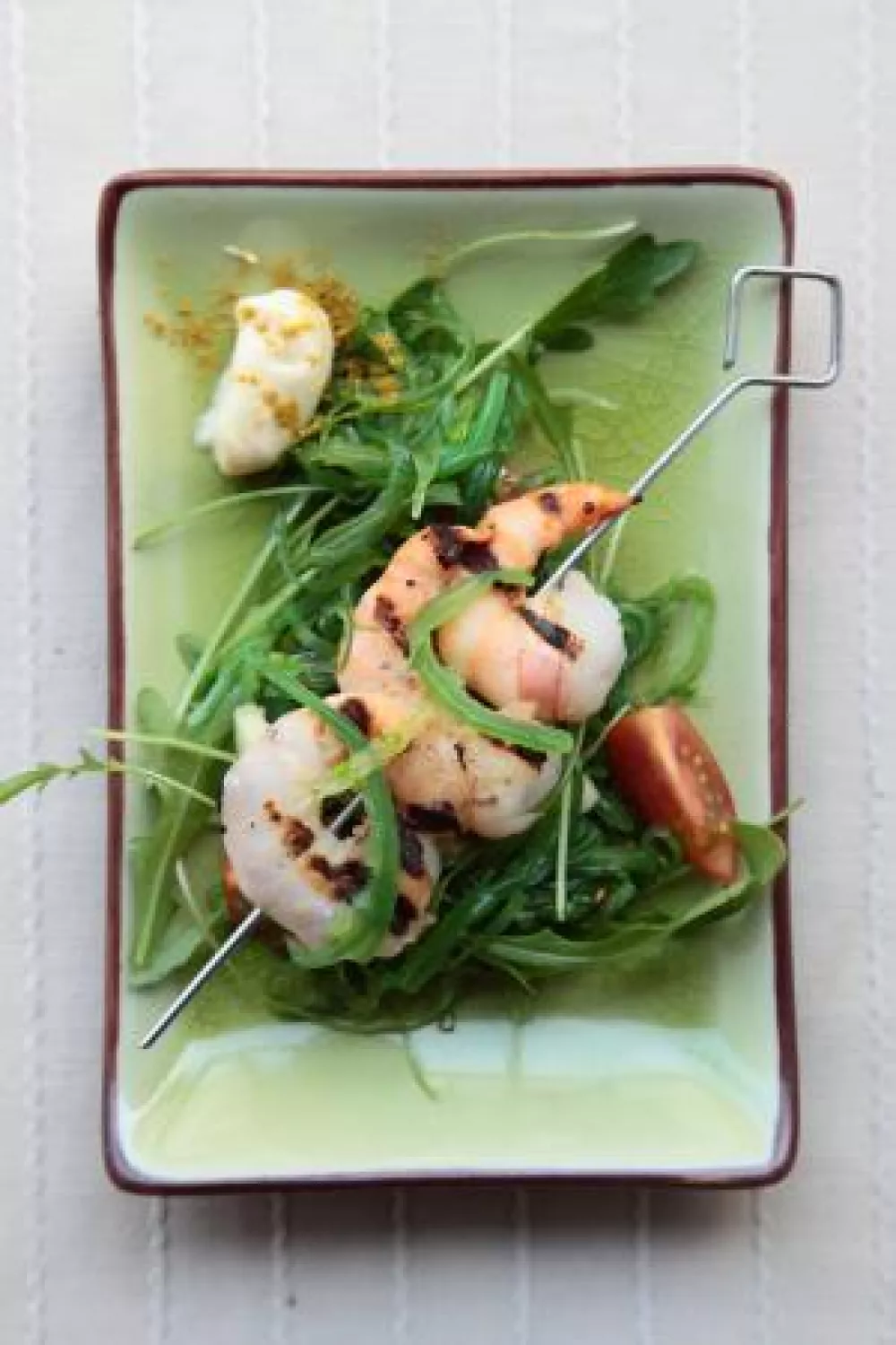 Verdeel de sla over de borden, leg het spiesje met de scampi erop. Werk af met de currymayonaise, wat rasp van limoen en currypoeder.