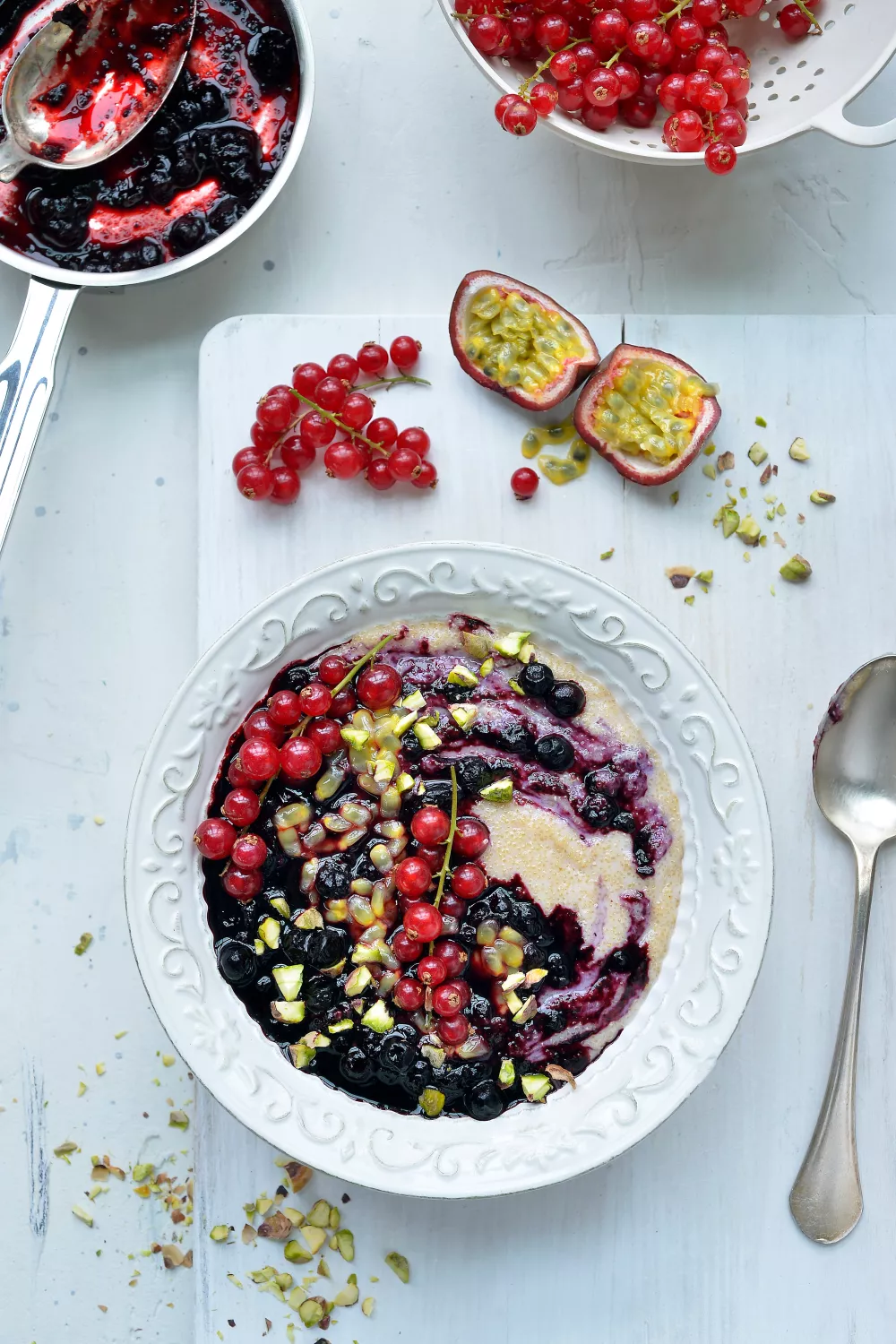 Doe de amarantpap in een diep bordje. Doe er de coulis over. Voeg er eventueel nog wat extra bessen bij en werk af met pistachenootjes.