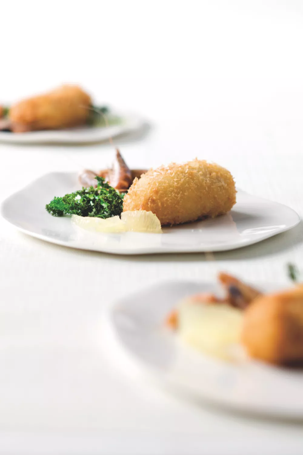 Laat de kroketten ongeveer 1 uur opstijven in de koelkast. Frituur ze goudgeel op 180 °C in arachideolie.