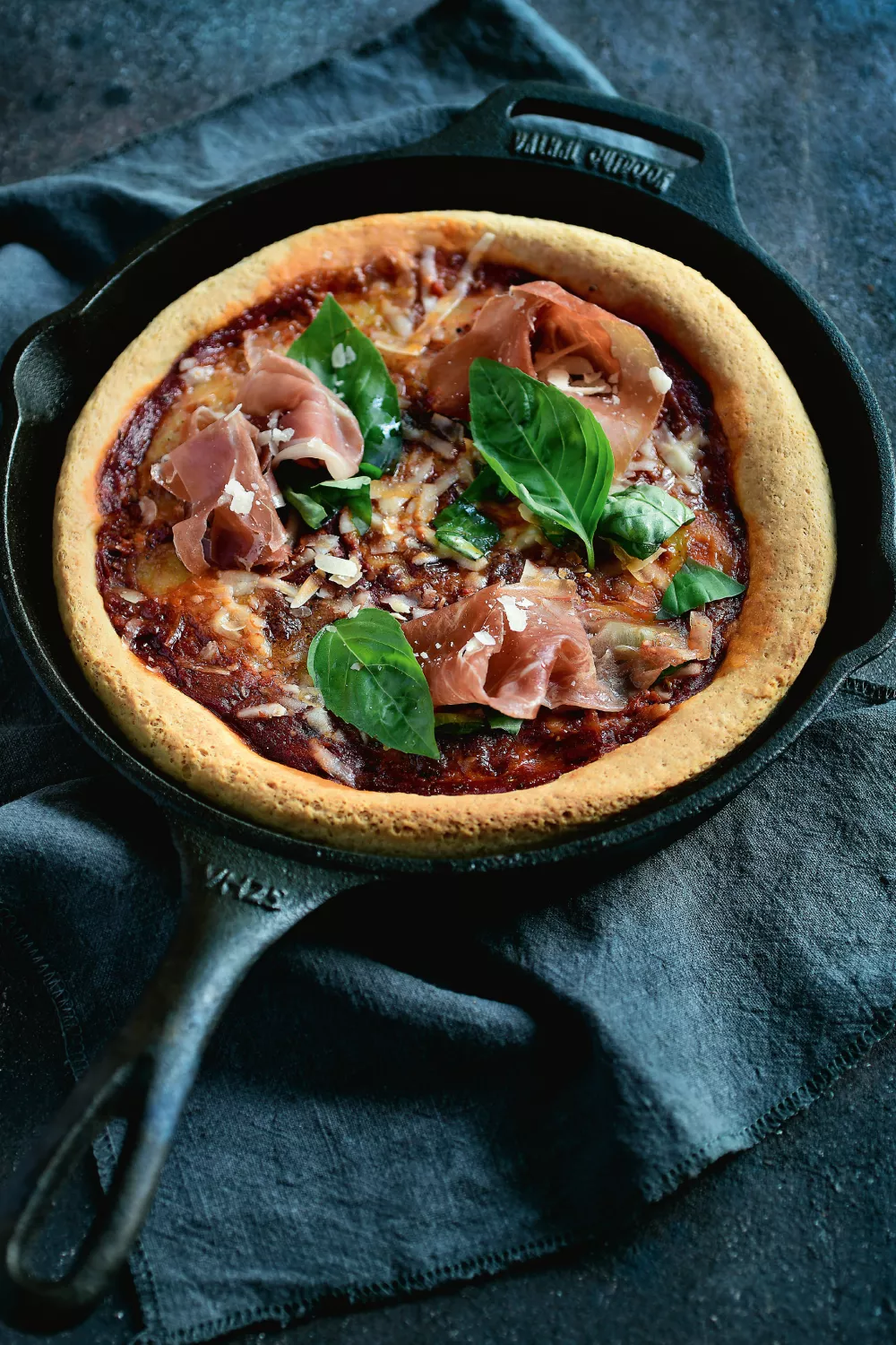 Deze American panpizza heeft een dikke, goudbruine korst en een luchtige binnenkant dankzij een deeg met tarwebloem en maïsmeel, gebakken in een ingevette gietijzeren pan. Een pittige tomatensaus met harissa, gesmolten mozzarella en de zoute toets van prosciutto en parmezaan geeft hartige, mediterrane smaken die ideaal zijn voor een ontspannen weekendmaaltijd of gezellige avond met vrienden. Ovengebakken comfort food met een Italiaanse twist.