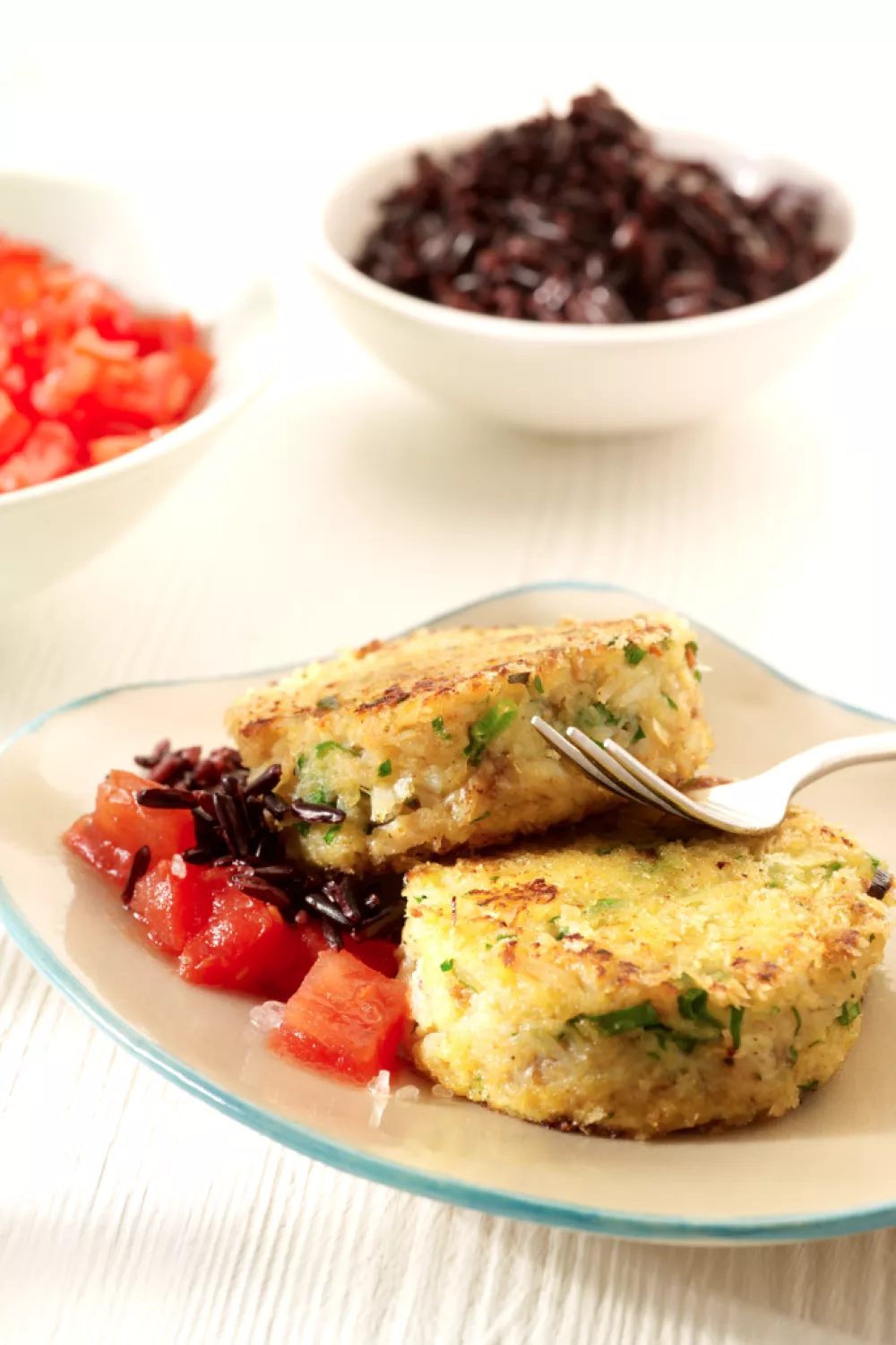 Serveer de crabcakes met de tartaar van tomaten. Lekker met wilde rijst.