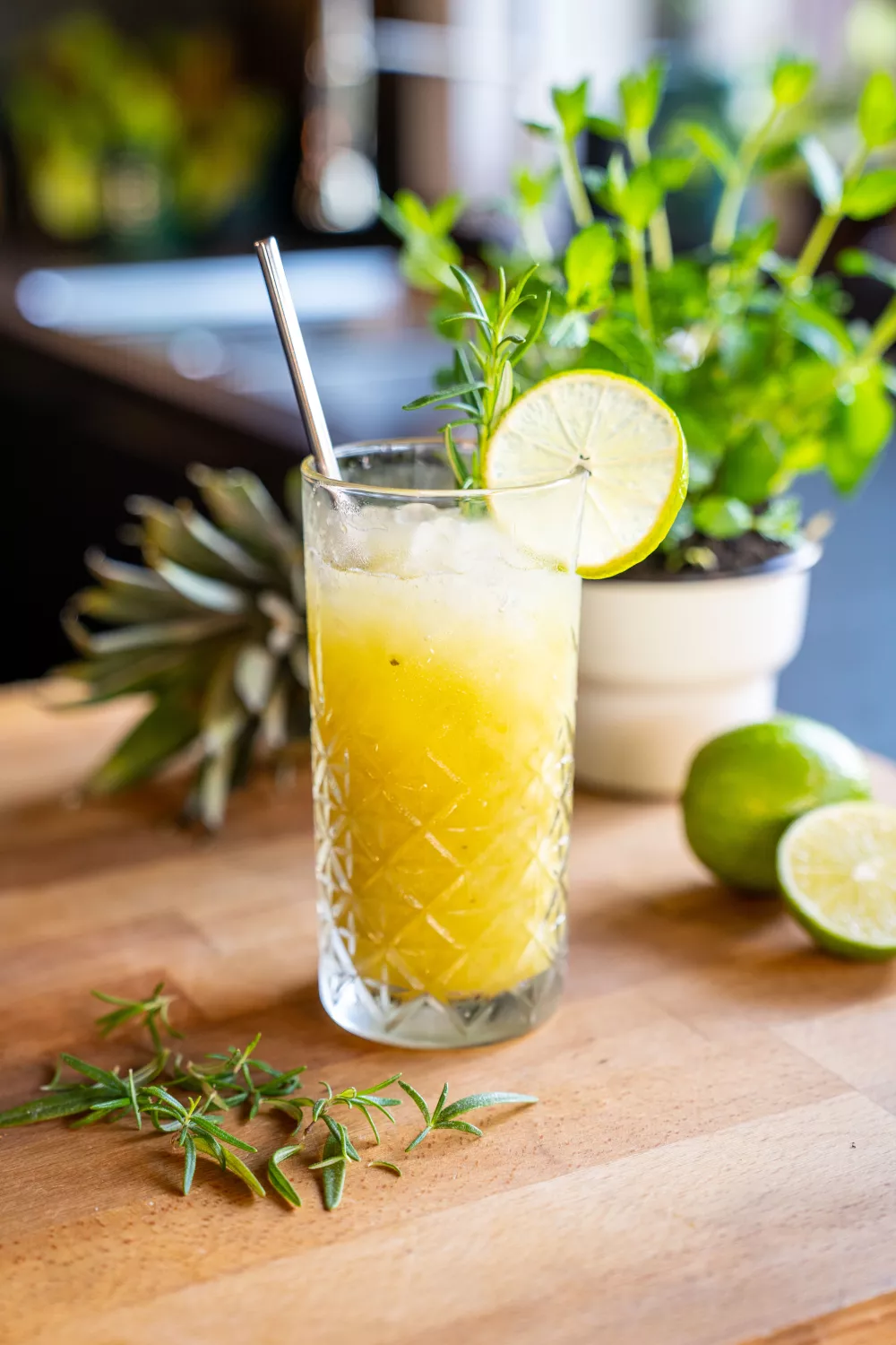 Zomerse ananascocktail met wodka en rozemarijn waarbij gestoofde ananas tot een zijdezachte, gezeefde coulis wordt geblenderd en gekoeld. Met limoensap en crushed ice ontstaat een verfrissende, licht kruidige longdrink die perfect is als aperitief of bij een tuinfeest of barbecue. Werk af met een schijfje limoen en een takje rozemarijn voor extra geur en uitstraling.