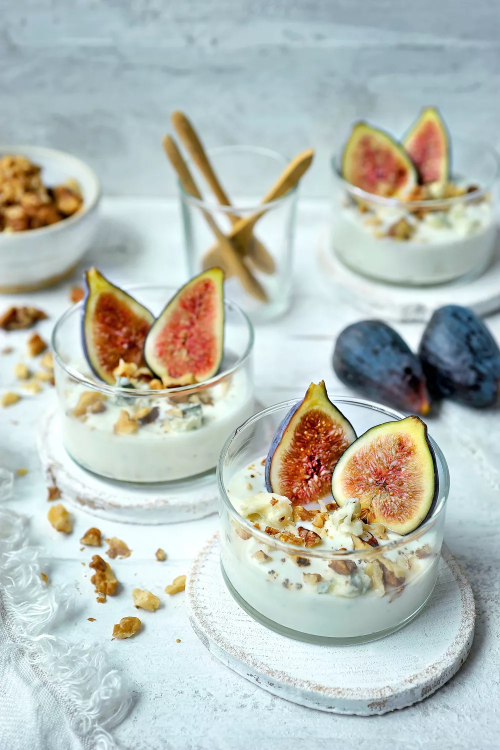 Aperitiefglaasjes met vijgen, noten en roquefort