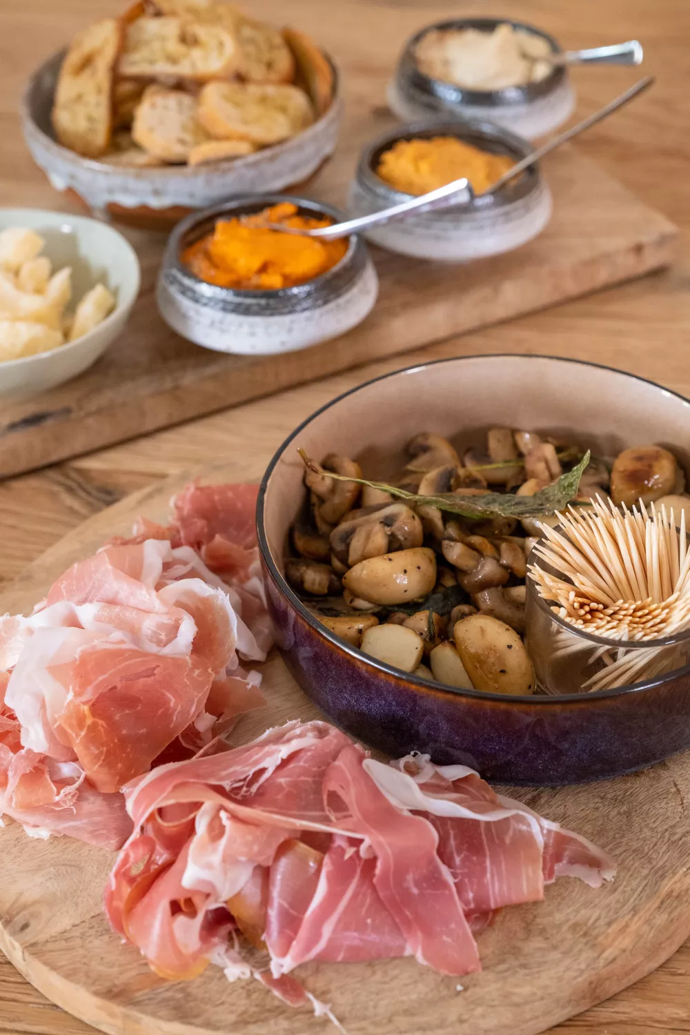 Schik de champignons samen met de ham, aperodips en de sneetjes stokbrood en de stukjes Parmezaanse kaas.