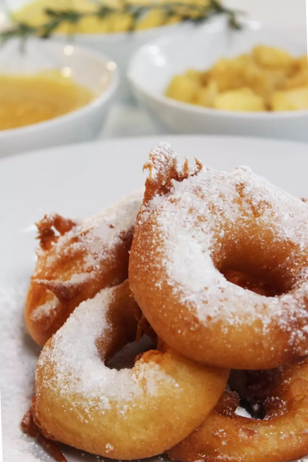 Meng alle ingrediënten voor de beignets in een grote mengkom. Schil de appels en verwijder het klokhuis met een appelboor. Snijd de appels vervolgens in schijfjes. Haal de appelschijfjes door het beignetbeslag en frituur ze mooi krokant en goudbruin in een friteuse op 160 graden.