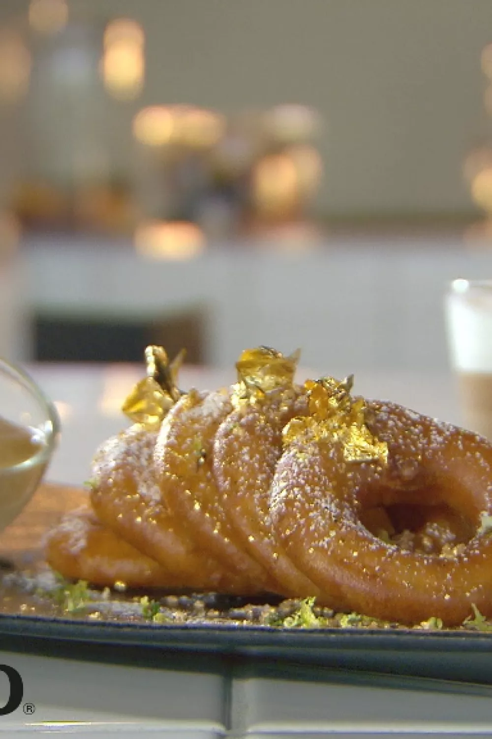 Leg de beignets op een bordje. Werk af met bloemsuiker, goudsuiker en bladgoud. Serveer met de karamelsaus en een kopje NespressoCaramelito gezet als cappuccino.