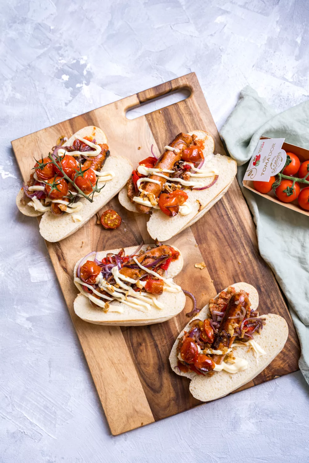 Deze Arabische hotdog met pittige merguez en romige muhammara brengt rokerige, zoete en hartige tonen samen in één broodje. Geroosterde kerstomaatjes, geblakerde paprika en gebakken merguez geven diepte, terwijl harissa, mayonaise en krokante uitjes zorgen voor pit en crunch. Perfect als smaakvol streetfood voor een zomerse barbecue of gezellige borrel.