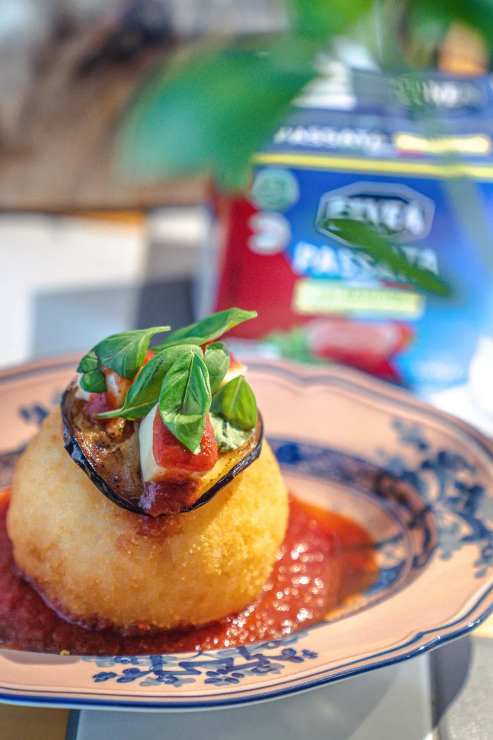 Schep een lepel van de warme passata op bordjes en schik er een arancini bovenop. Werk af met ee schijfje aubegine en verse basilicum.