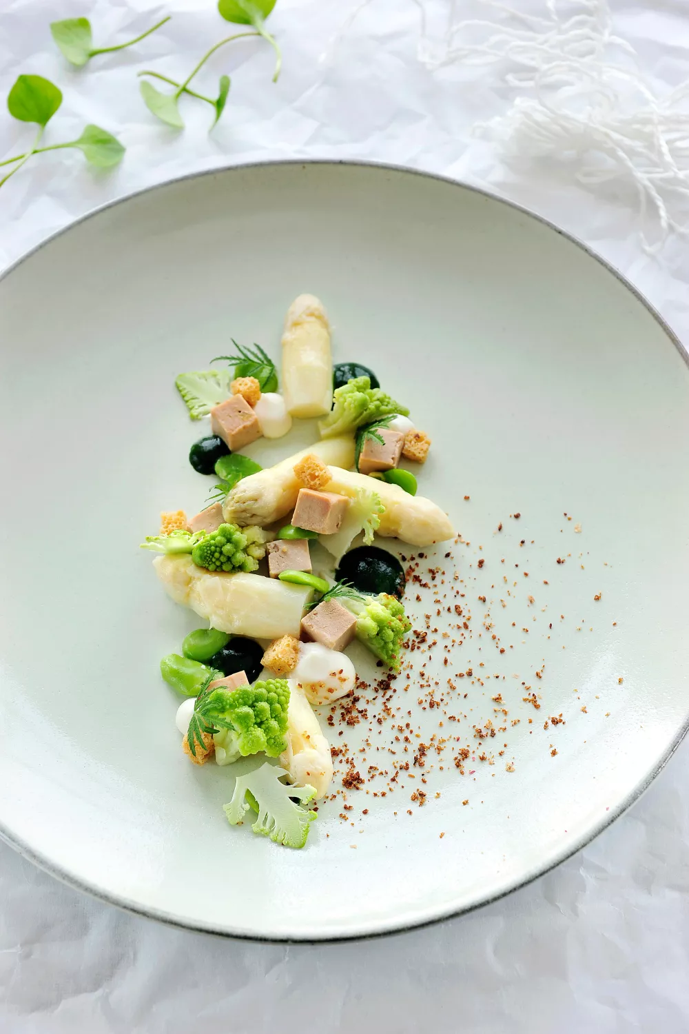 Een elegant lentegerecht met witte asperges, romige aspergecrème en blokjes ganzenleverterrine, afgewerkt met krokante croutons en een pittige waterkerscoulis. De bereiding combineert klassieke technieken zoals blancheren, sauteren en pureren met geblancheerde tuinbonen en dunne plakjes romanesco voor extra textuur. Zacht en romig met een frisse kruidige toets van peterselie en waterkers, perfect als feestelijk voorgerecht of verfijnde lunch.