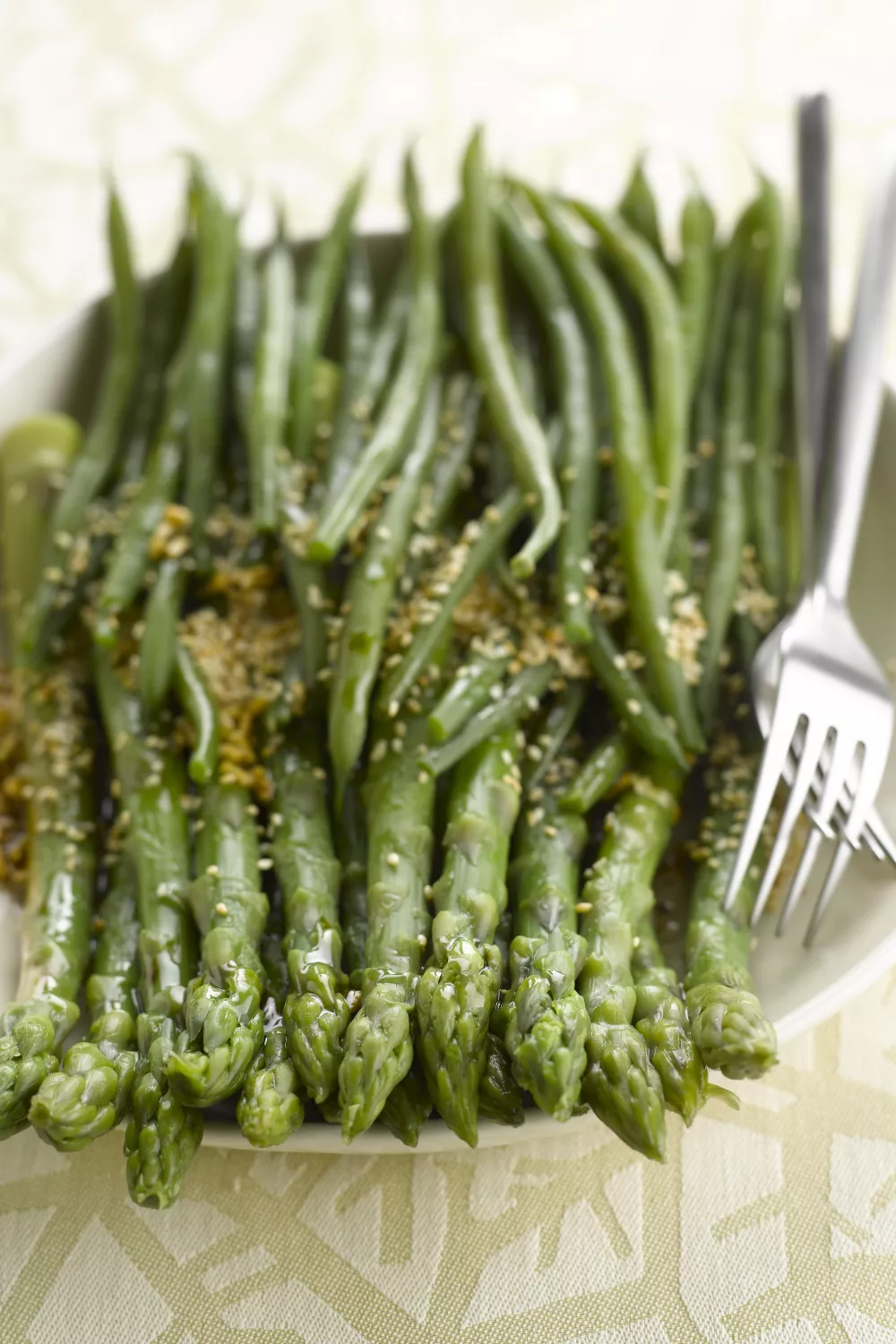 Frisse voorjaarssalade met knapperige groene asperges en sperzieboontjes, beetgaar gekookt en omgeschept met een aromatische dressing van limoen, sherry, honing, knoflook en een vleugje ketjap. De geroosterde sesam geeft crunch en een Aziatisch accent. Perfect als vegetarisch bijgerecht bij de barbecue of als lichte doordeweekse lunch.