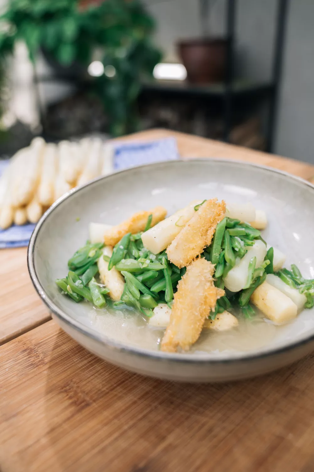 Witte asperges met knapperige snijbonen brengen een frisse lentesmaak, ideaal als lichte lunch of elegant voorgerecht. Gekookte en kort geblancheerde groenten wisselen af met goudbruin gefrituurde aspergestukjes in panko, waardoor zacht en krokant elkaar aanvullen. Met sjalot, boter en een scheut kippenbouillon zet je snel een smaakvol, minimalistisch gerecht op tafel dat zowel bij een doordeweekse maaltijd als bij een feestelijk diner past.