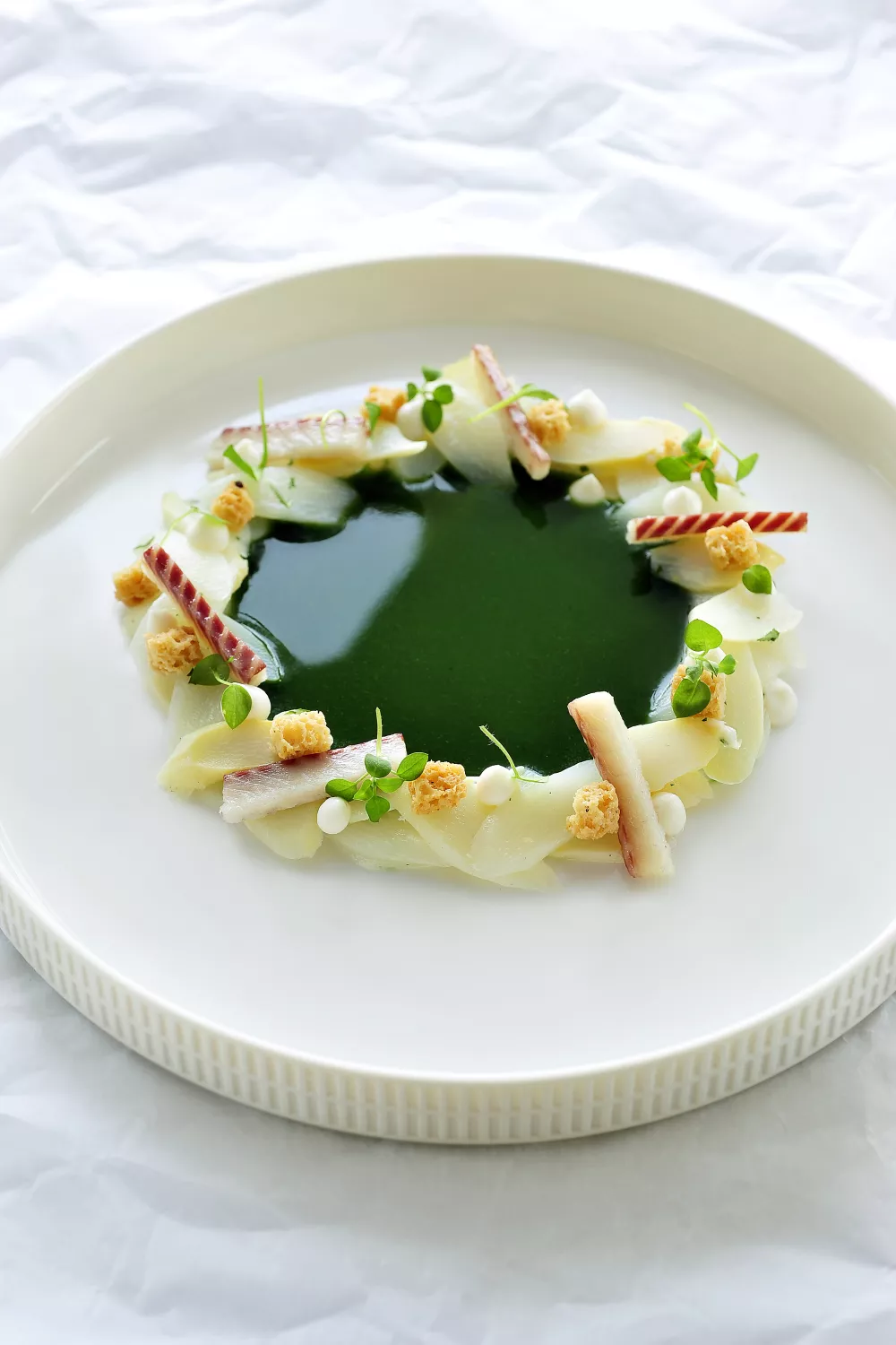 Schik de asperges rond een ring op een koud bord. Werk de cirkel af met paling, blaadjes postelein en enkele broodkorstjes. Lepel de soep in het midden.